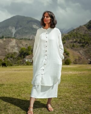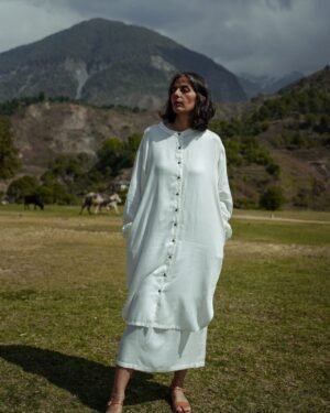 Available in multiple lengths, this unisex button-up shirt is a staple piece. A relaxed look through the body, with pockets, and details in the side split and back yoke.; Craft: Handloom Weaved, Material: Lotus Silk, Return Policy: Non-Returnable, Shipping: 8 to 10 Working Days, Fit: Loose, Occasion: Casual, Sleeve: Yes, Care Description :"Washing Instructions: Fill your bucket with cold water, turn your Lotus silk item inside out, and submerge it. It comes to washing your Lotus silk item, your best bet is to use a high-quality liquid detergent. Add a few detergent drops into the water and stir it well, then leave your item in the solution for three minutes. Gently pull your garment up and down for three to five minutes to remove any dirt. Take your garment out from the sink, drain off the water, and rinse under cold water until the detergent has been completely washed out.