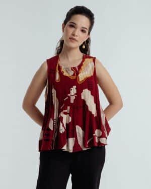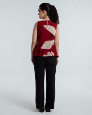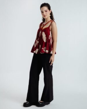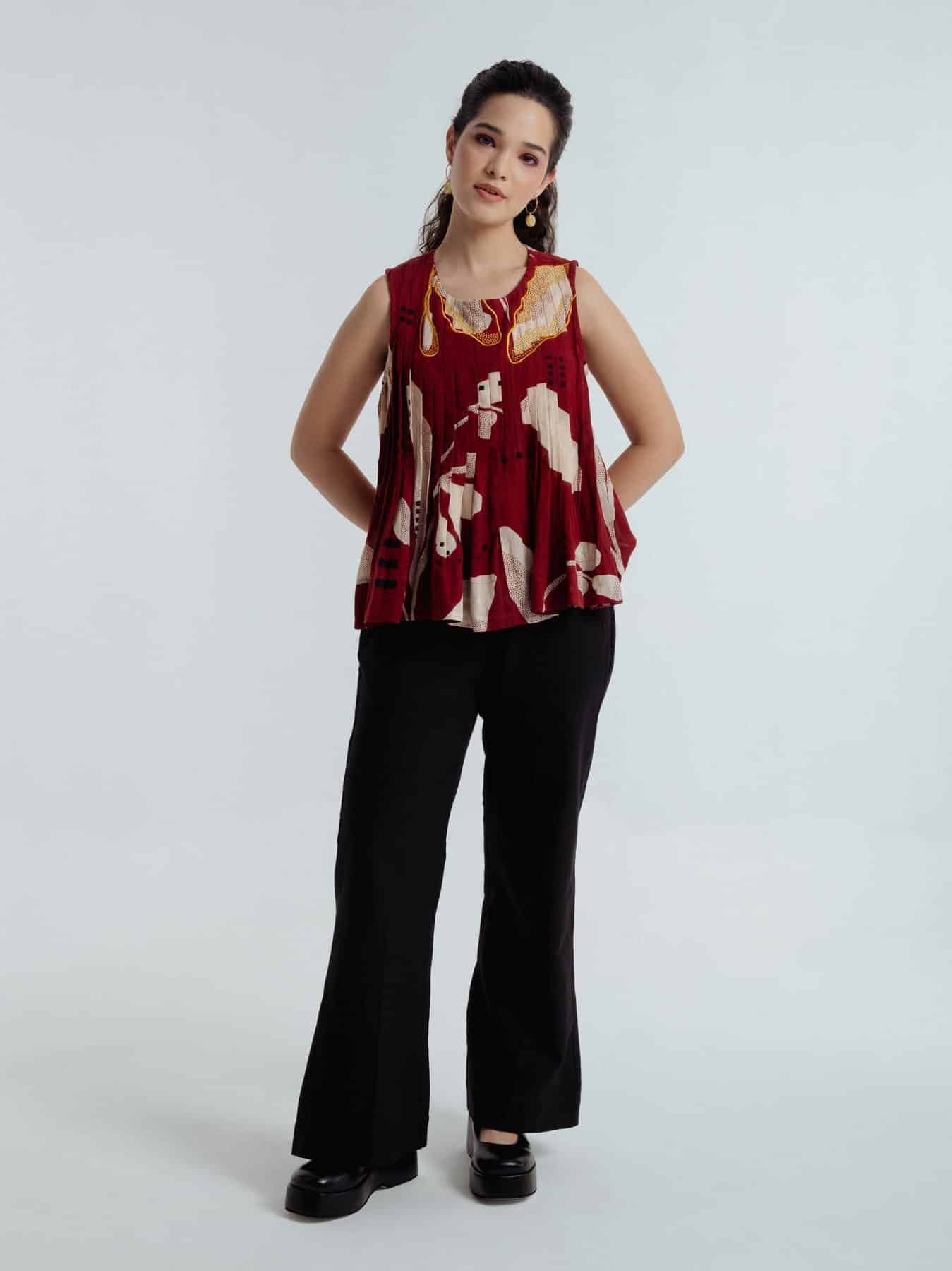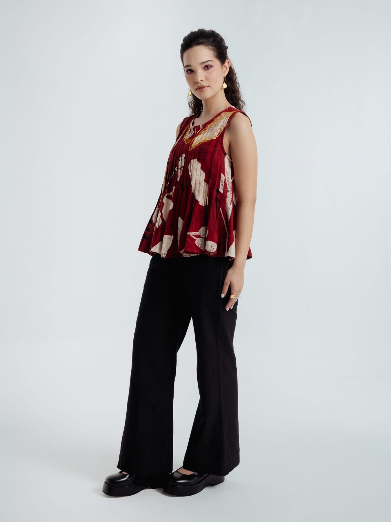 This sleeveless top is a study in precision and grace. The bodice is entirely pleated with careful craftsmanship and adorned with fine mustard-hued, machine-embroidered dots that form a delicate, organic pattern. Designed to fit neatly across the upper chest, it falls effortlessly, creating a smooth, flattering line that moves with ease.The garment length is 23 inches ,Model height is 5"7 wearing S