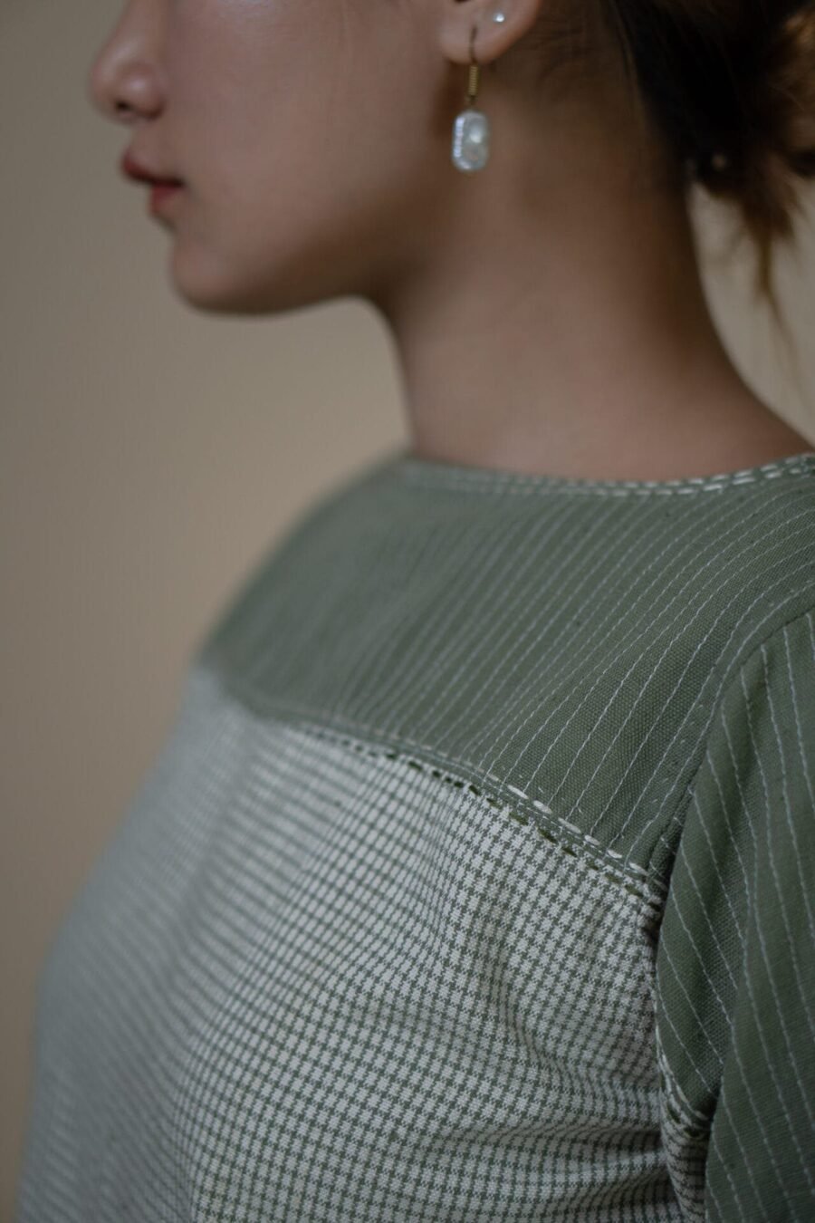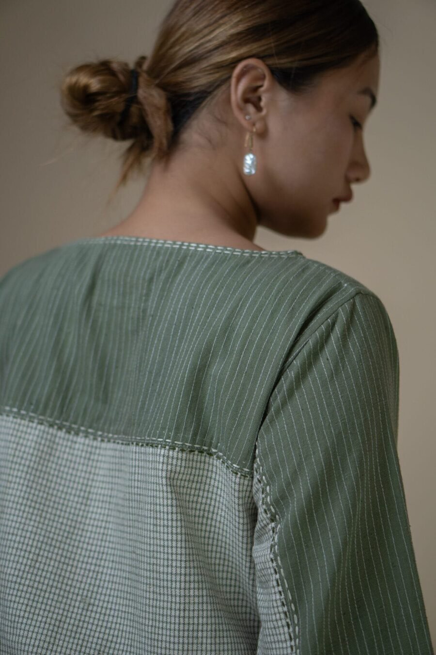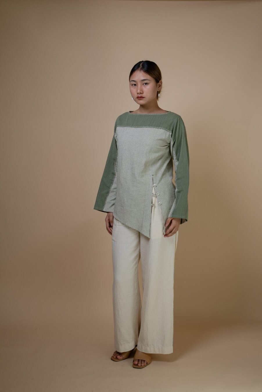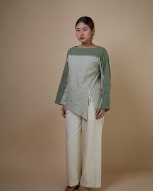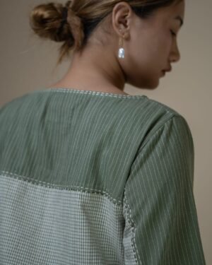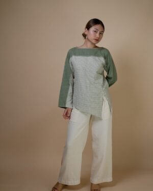Crafted from 100% cotton fibers, the Meadows Asymmetric Blouse is a blend of two Kala Cotton fabrics- solid and checkered olive textiles, dyed using Azo-free dyes.