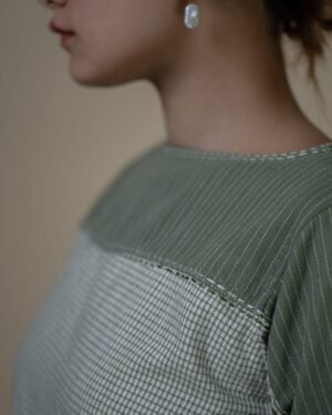 This asymmetric silhouette features colour blocking, with a solid olive panel on the yoke that flows onto the sleeve, highlighted by contrasting stitch lines. The checkered section extends into an asymmetrical hem with button-loop detailing, while Kantha embroidery adorns the yoke, extending across the sleeves and neckline for a refined finish.