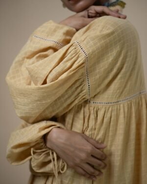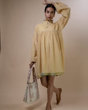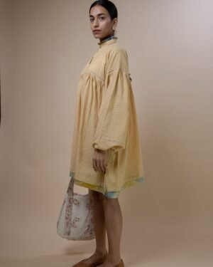 Crafted from 100% cotton fibers and natural materials, the Meadows Gathered Short Dress is naturally dyed using Myrobalan and Madder.