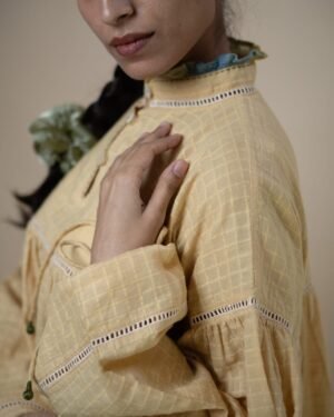 The design features a raised neckline adorned with cascading ruffles, beautifully complemented by hand-painted Mulmul in shades of blue, yellow, and green, which complete the vibrant palette. The same fabric extends into the hem for a cohesive look.