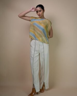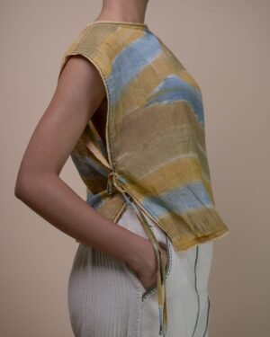 This cropped bib is accented with Kantha embroidery. Open at the sides and secured by drawstrings, it offers a flattering, free-size fit. Perfect for layering or wearing on its own, this cropped piece is a true trans-seasonal staple, adaptable to any weather or style.