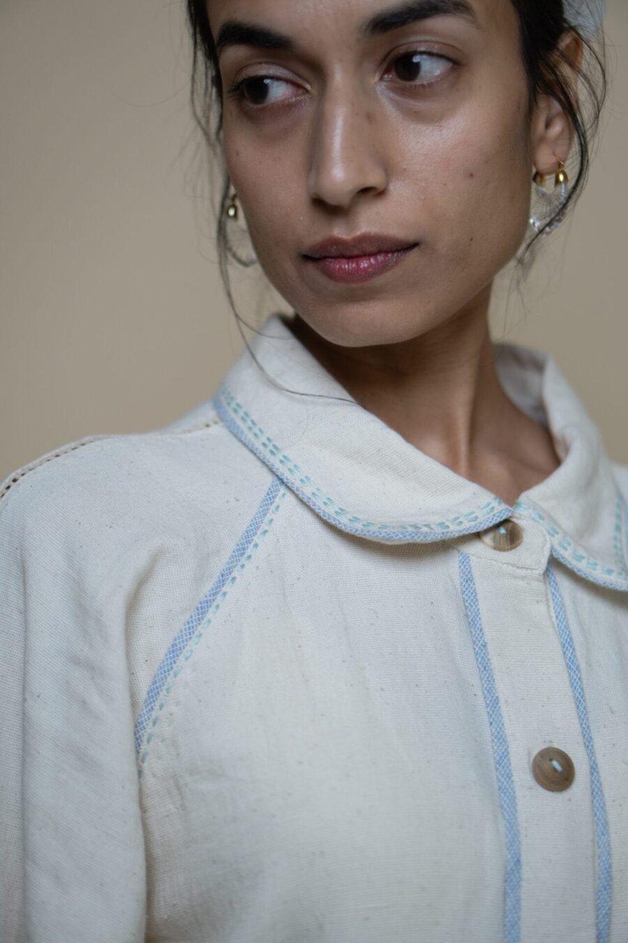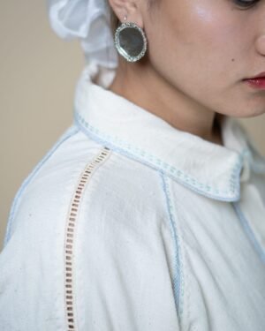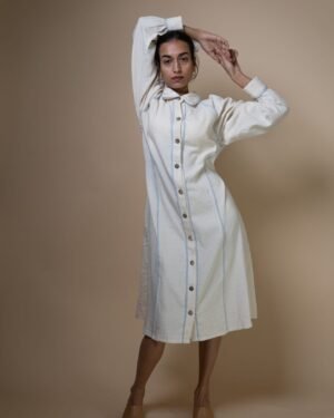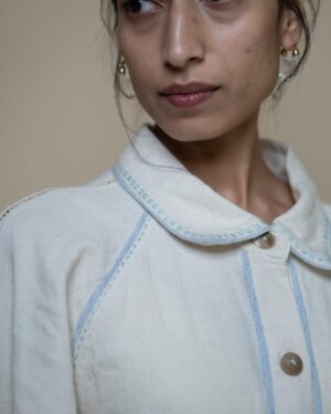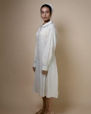 This classic shirt dress features a subtly flared silhouette. Kantha embroidery runs along the panels, complemented by piping in handwoven blue fabric. A drawstring at the waist offers the option to cinch for a more fitted look. The voluminous sleeves taper into the cuffs, accented with delicate lace inlays.