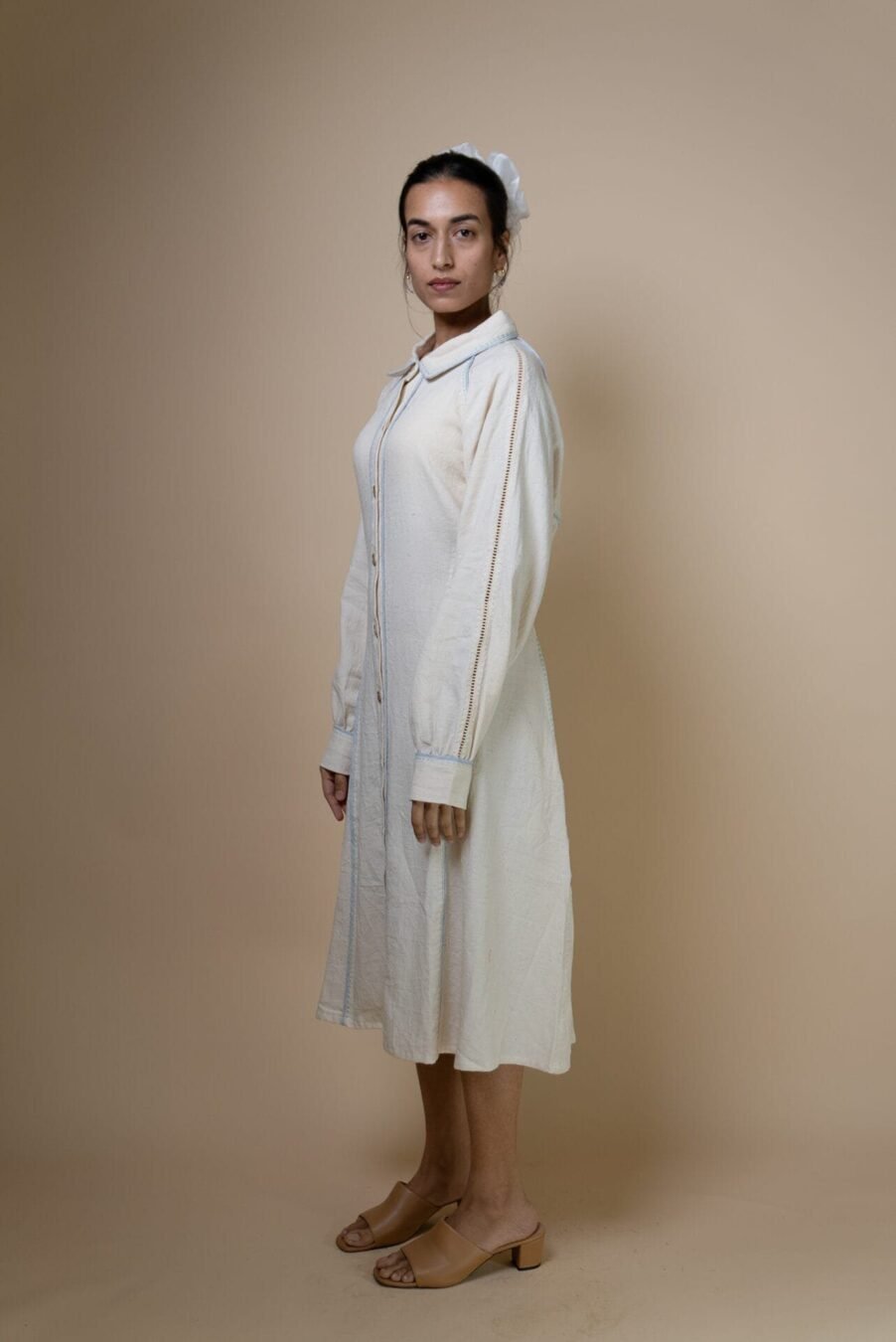 Crafted from 100% cotton fibers and natural materials, the Meadows Panelled Shirt Dress is made from undyed & unbleached Kala cotton.