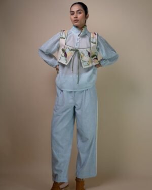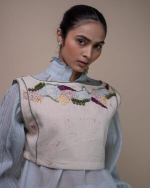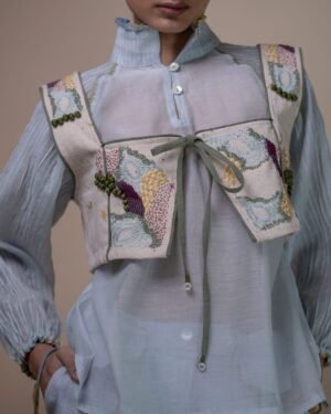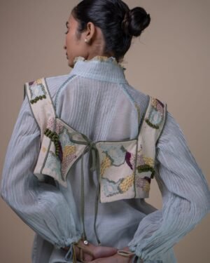 This Meadows Reversible Tie-Up Blouse is crafted in our signature Kora Denim, with thoughtfully reimagined surface design. This blouse is eco-printed using temple flower waste such as roses, hibiscus, and marigolds that have been collected, segregated and repurposed for printing. Intricate hand embroidery techniques such as wooden bead embellishments, French knots, bullion knots, lazy daisy stitches, and traditional Kantha lines. Flowing organically from the neckline and cascading downward, the embroidery mimics the natural flow of moss thriving on a shaded forest floor, reflecting the gentle, uneven textures and rich, earthy colours. This sleeveless blouse features a square neckline on one side and a boat neck on the other, complemented by contrasting olive piping details. The asymmetrical shape adds visual interest, while drawstrings serve as a delicate closure. The feature of reversibility is an element of multi-functionality involving the wearer in the process of choice and interchangeability. Type of Button used: