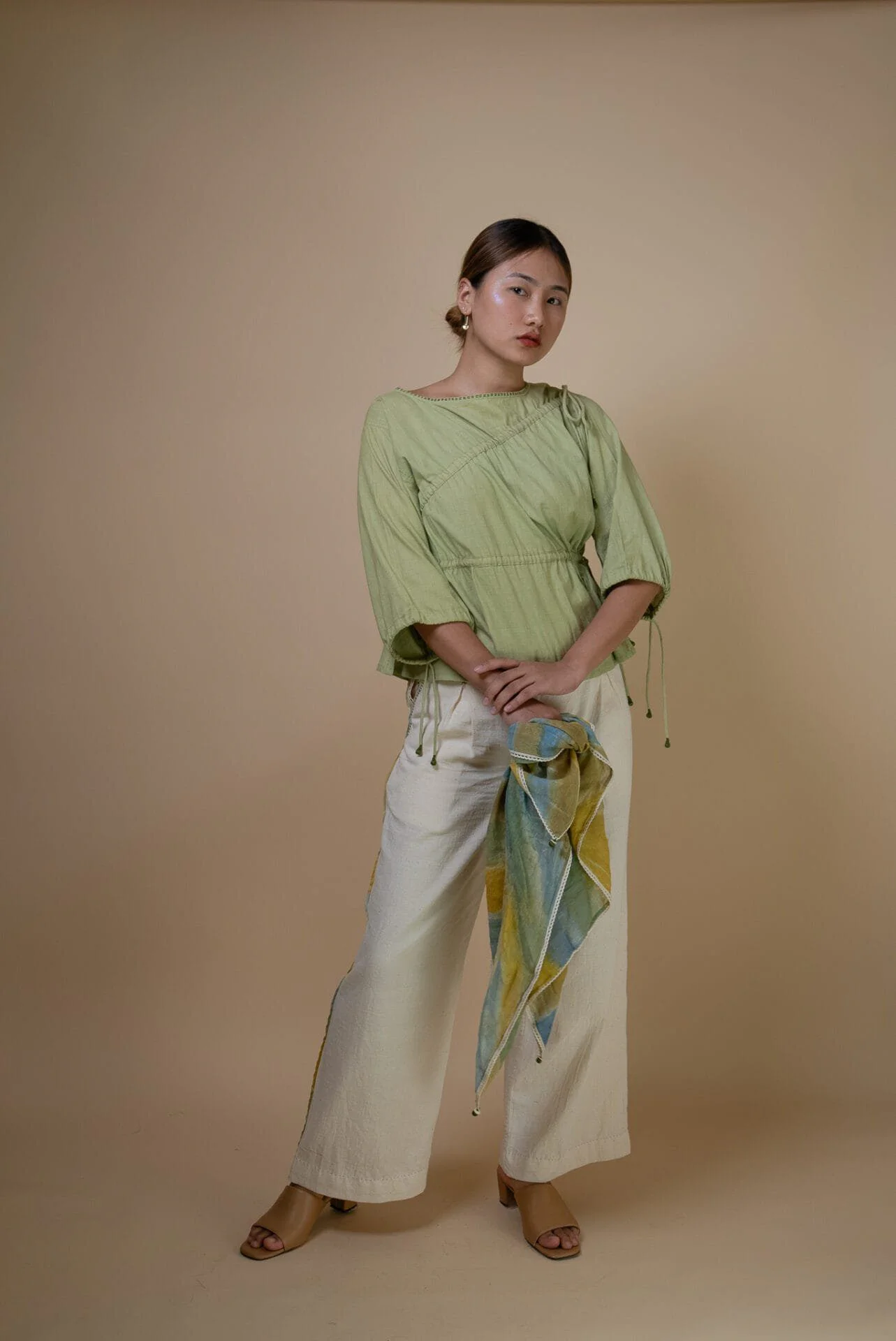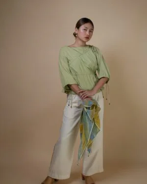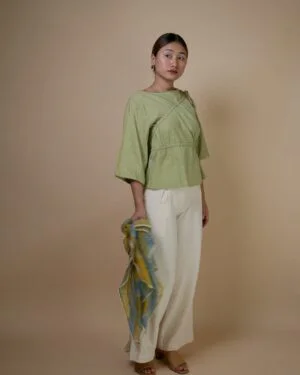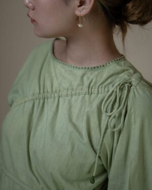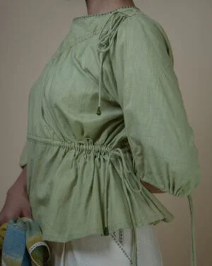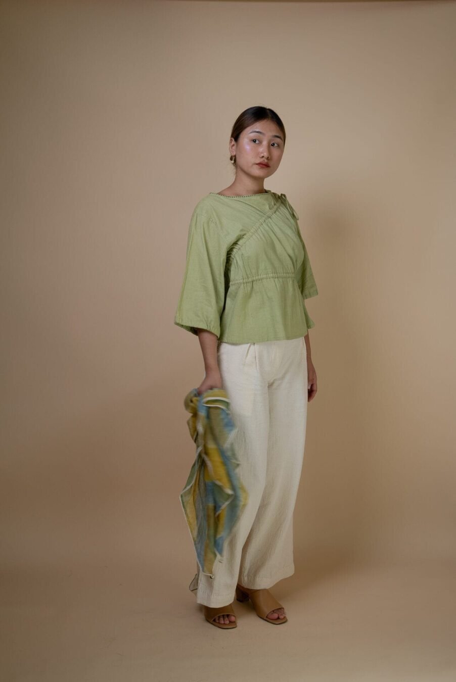 Crafted from 100% cotton fibers and natural materials, the Meadows Ruched Blouse is made from handwoven sage green cotton, naturally dyed with indigo and pomegranate. The subtle slubbed texture of the fabric adds a unique character to the piece.