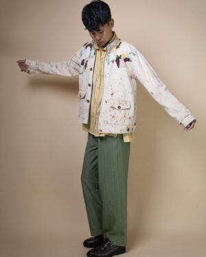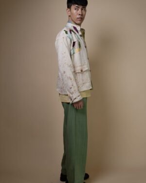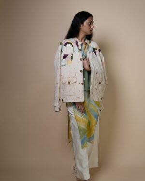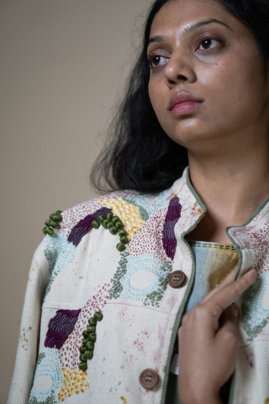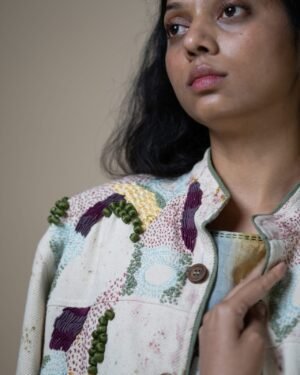 The intricate hand embroidery showcases a mix of techniques? embellishments with wooden beads, delicate French knots, bullion knots, lazy daisy, and traditional kantha stitches. Flowing organically from the shoulder, the embroidery mimics the natural spread of moss, giving each jacket a unique, handcrafted finish.