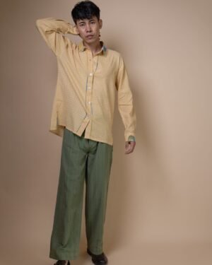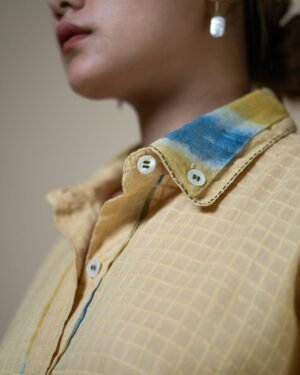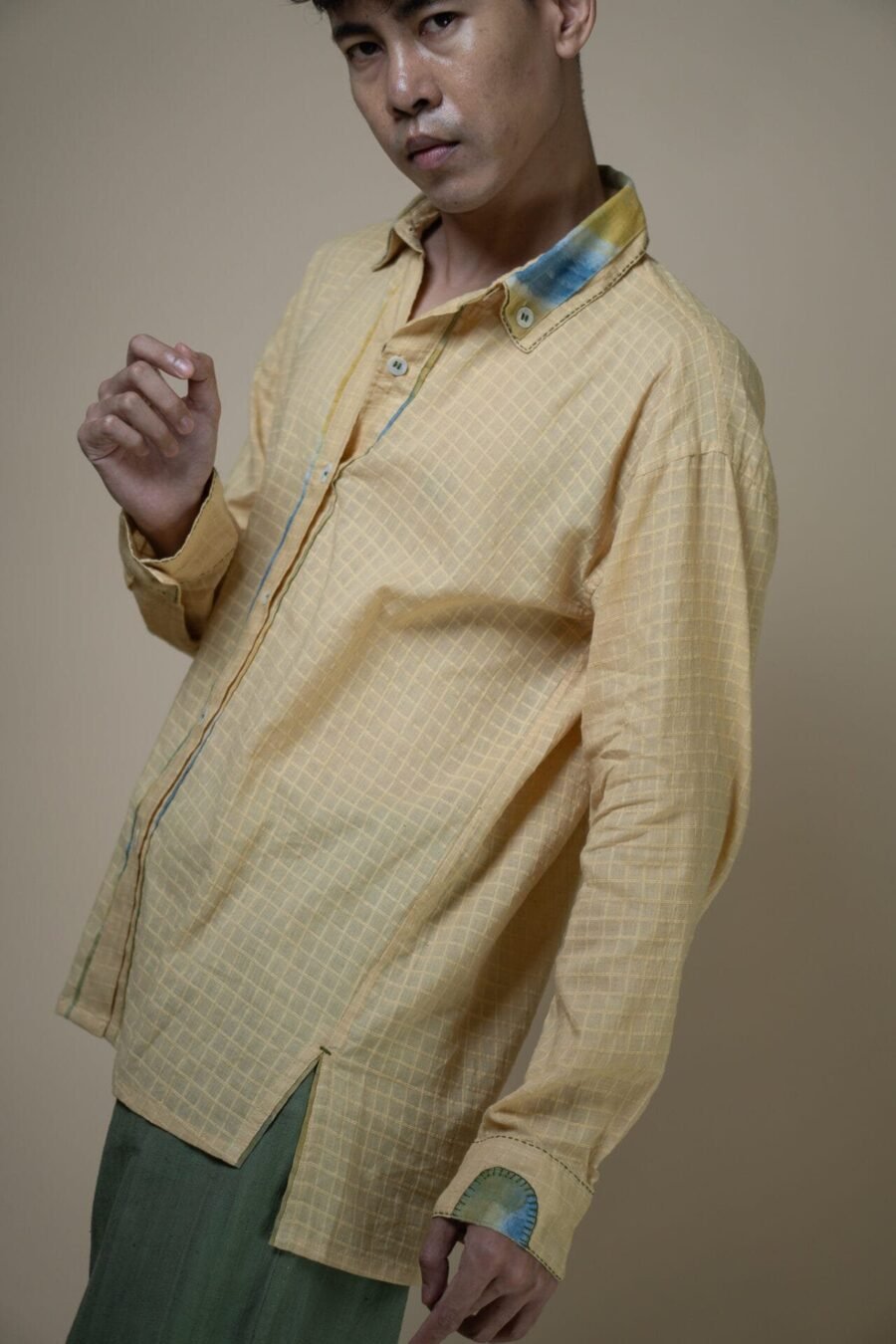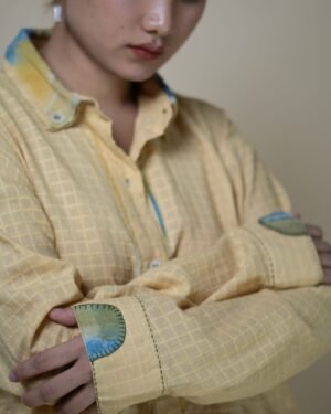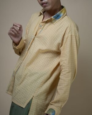 The design features a classic shirt collar, accentuated with hand-painted Mulmul piping along the collar, placket, and cuffs. Thoughtful details like small front slits and patched Mulmul cuffs, highlighted with blanket stitches, introduce a playful splash of colour. Kantha embroidery on the cuffs adds an artisanal touch, elevating the shirt while maintaining a comfortable fit.
