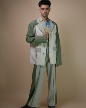 Crafted from 100% cotton fibers and natural materials, this blazer thoughtfully combines both solid and checkered Kala cotton, azo-free dyed in a trans-seasonal olive colour; with undyed Kala Cotton.
