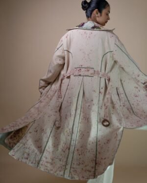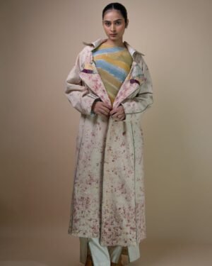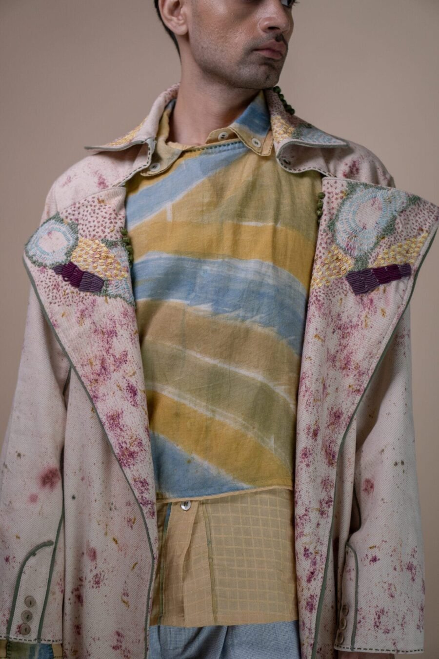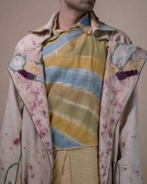 Intricate hand embroidery on the lapel showcases a blend of techniques-3D wooden bead embellishments, French knots, bullion knots, lazy daisy stitches, and traditional Kantha lines. Flowing organically from the lapel, the embroidery mimics the natural spread of moss, creating unique, uneven textures for each piece.