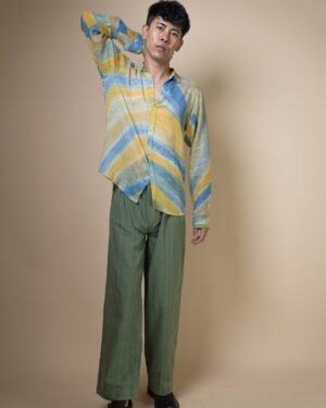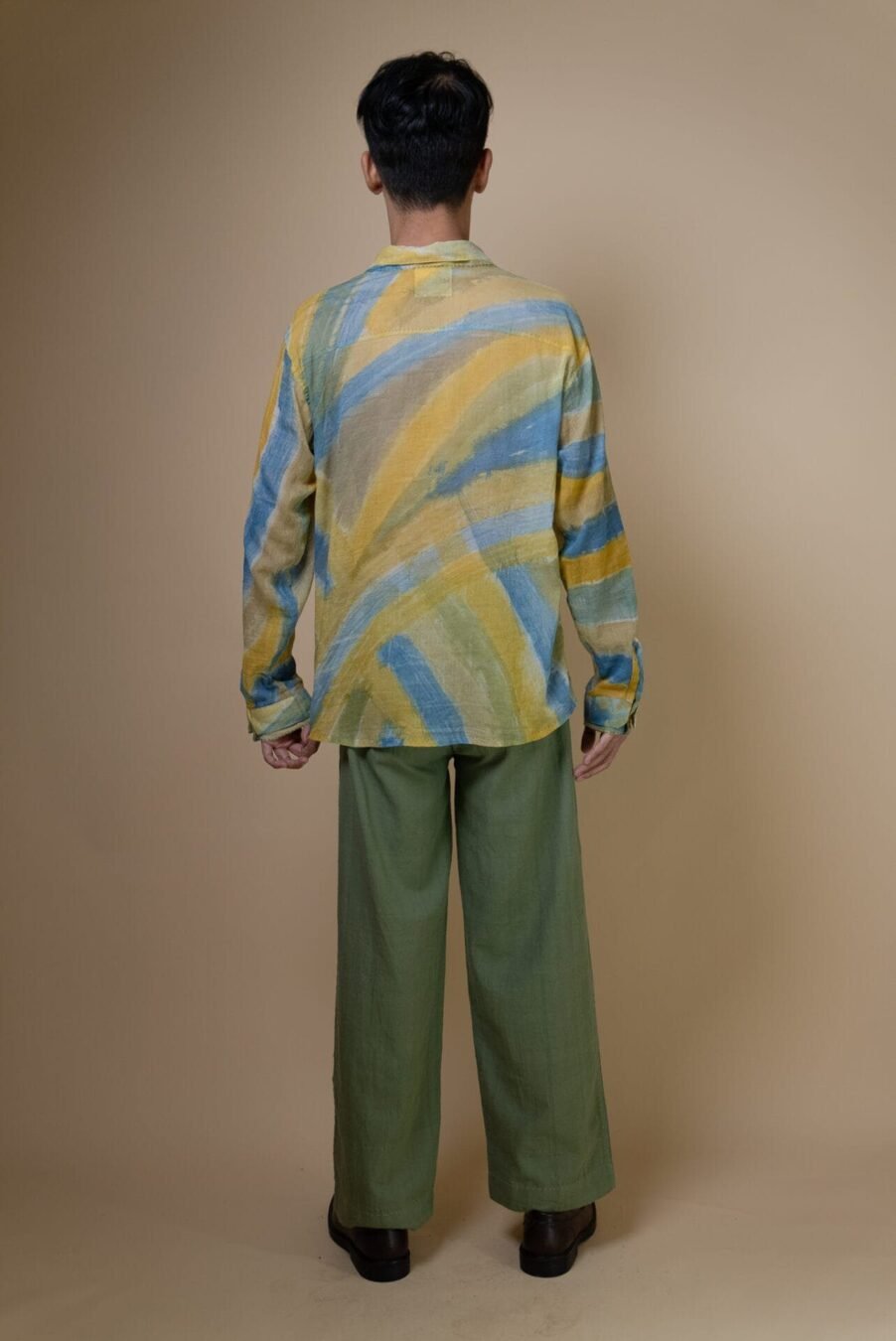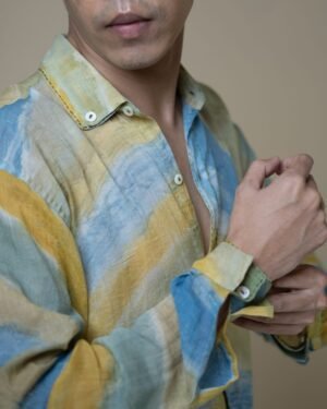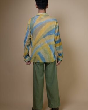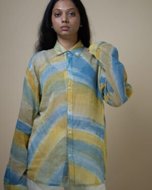 This sheer shirt features abstract hand-painted brushstrokes, accented with Kantha embroidery, double collars, and cuffs. Its breezy, lightweight silhouette makes it a statement piece, with the expressive brushstrokes as its focal point. Perfect for layering with a solid ensemble, it offers an effortlessly elevated look.