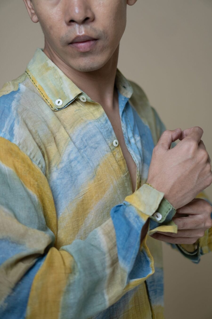 Crafted from 100% cotton fibers and natural materials, the Meadows Unisex Hand Painted Shirt is made from soft Mulmul, hand-painted with natural dyes from indigo, iron; and marigold flowers collected from temples and repurposed into dyes.