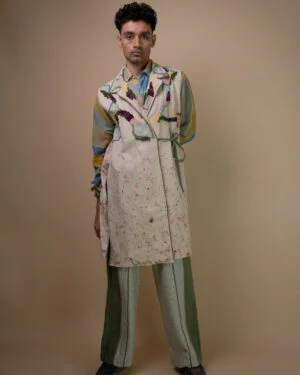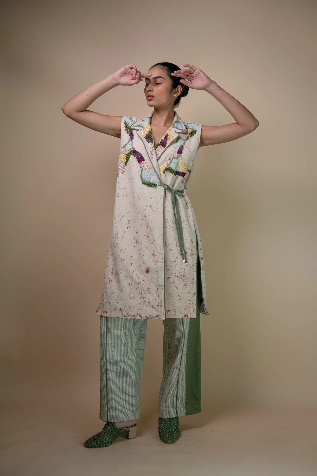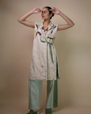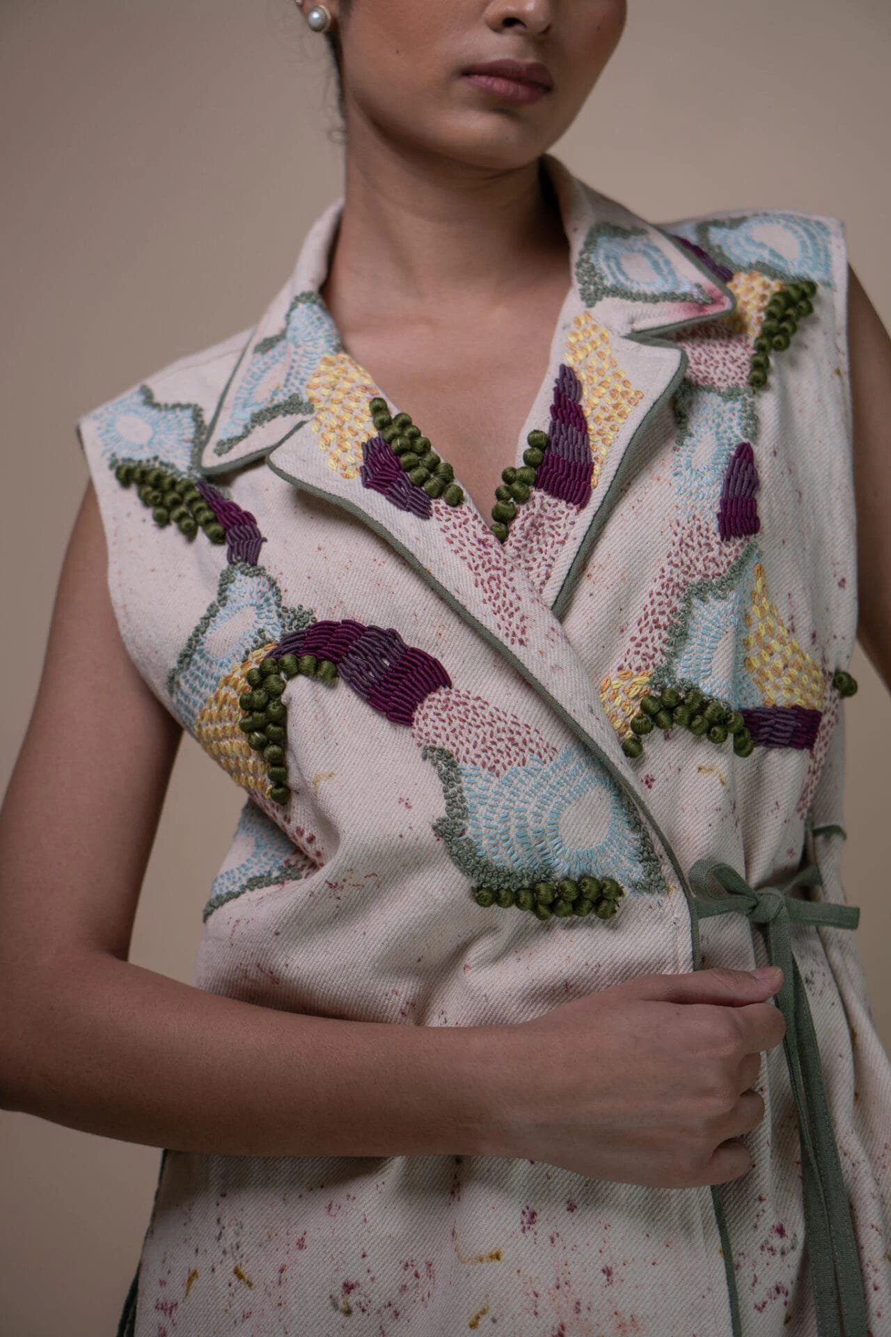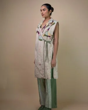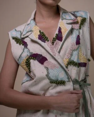 The intricate hand embroidery is an amalgamation of techniques such as wooden bead embellishments, French knots, bullion knots, lazy daisy stitches, and traditional Kantha lines. Flowing organically from the shoulder and cascading downward, the embroidery mimics the natural flow of moss, capturing its soft, varied textures and deep, earthy tones that evoke a serene, natural atmosphere.
