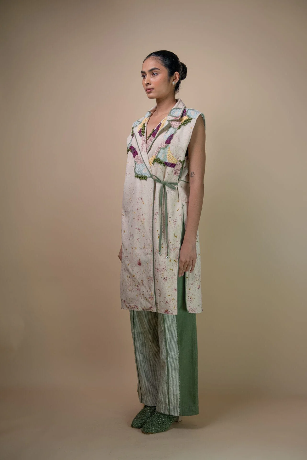 This Meadows Tie Up Overlay is crafted in our signature Kora Denim, with thoughtfully reimagined surface design. This overlay is eco-printed using temple flower waste such as roses, hibiscus, and marigolds that have been collected, segregated and repurposed for printing.