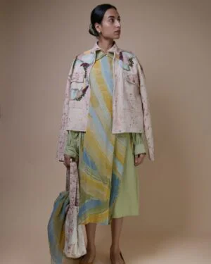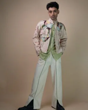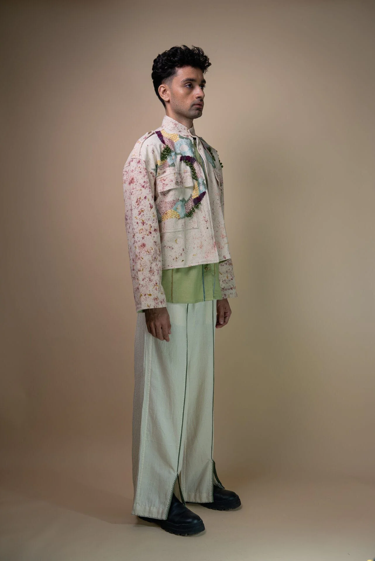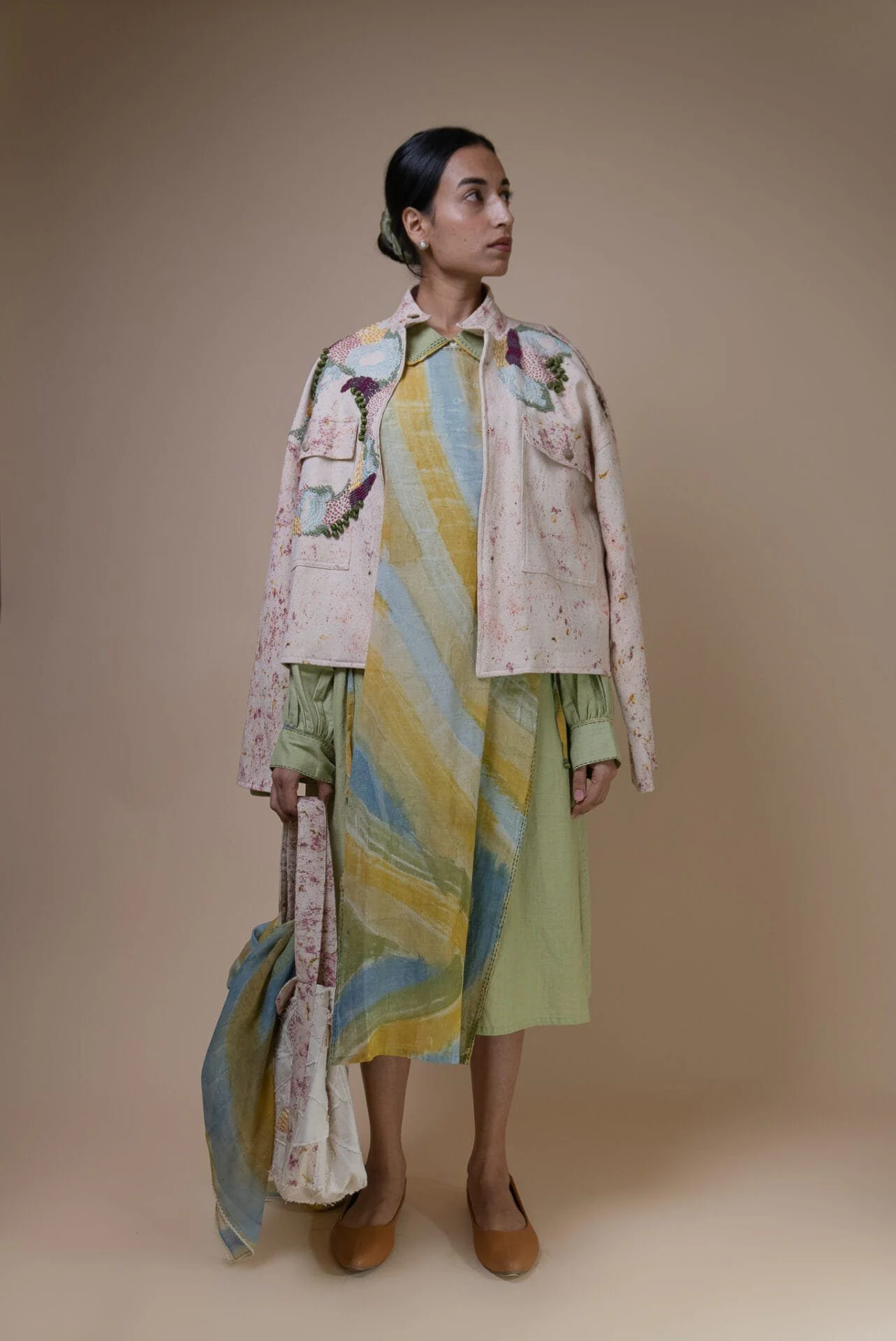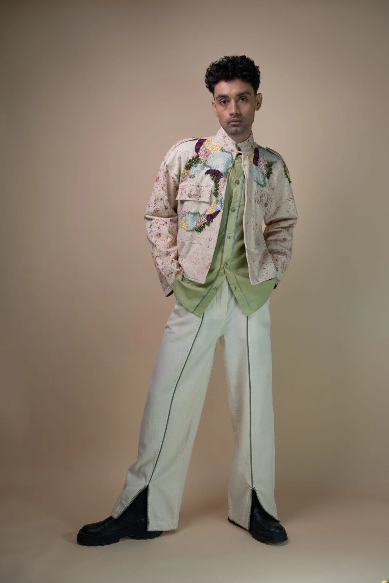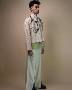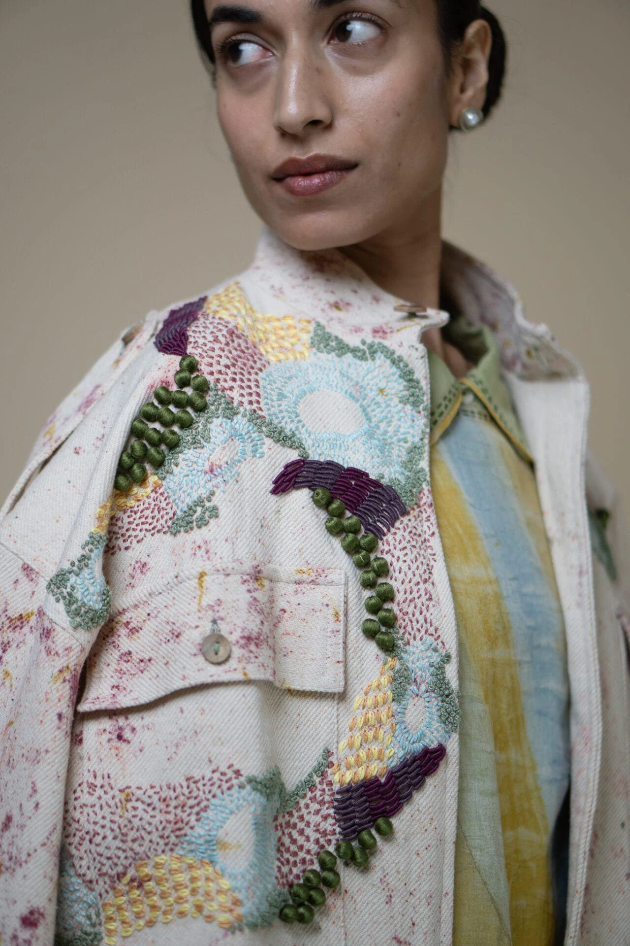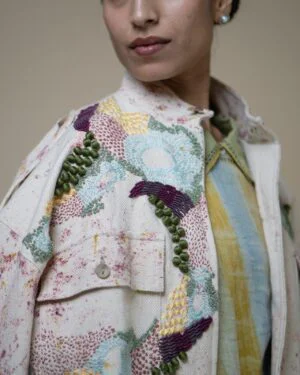 Intricate hand embroidery combines embellishments with wooden beads, French knots, bullion knots, lazy daisy stitches, and traditional Kantha work. The embroidery flows organically, mimicking the natural spread of moss, giving each jacket a unique, handcrafted finish.