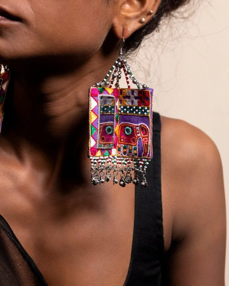 These exclusive handcrafted earrings are a stunning blend of traditional Indian motifs and contemporary design, making them the perfect accessory for the festive seasons of Navratri and Durga Pooja. Each earring is carefully crafted to reflect the rich cultural heritage of India, with intricate embroidery and bead hanging that add both elegance and charm. The earrings feature a beautiful embroidered elephant motif on one side, symbolizing strength, wisdom, and auspiciousness, which are central themes during the Durga Pooja celebrations. On the other side, there is an embroidered mirror design that creates a stunning visual reflection of the elephant, symbolizing the idea of seeing divinity and auspiciousness in all forms. This unique feature not only adds to the beauty of the earrings but also enhances their spiritual significance. The bead hanging at the bottom of the earrings adds movement and a touch of festive flair, making them an ideal choice for