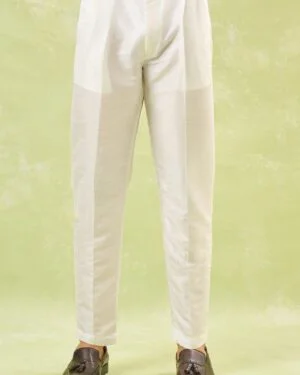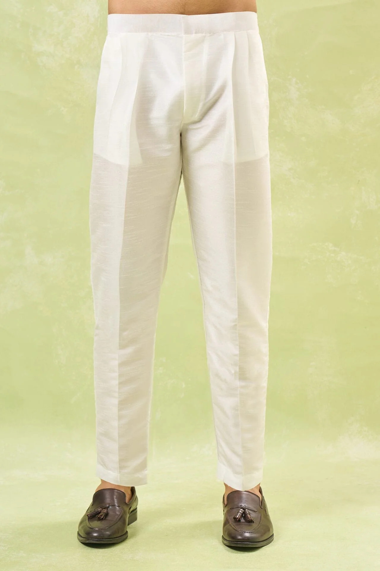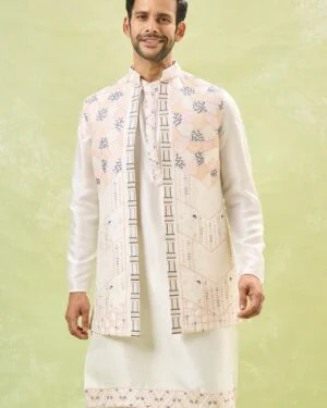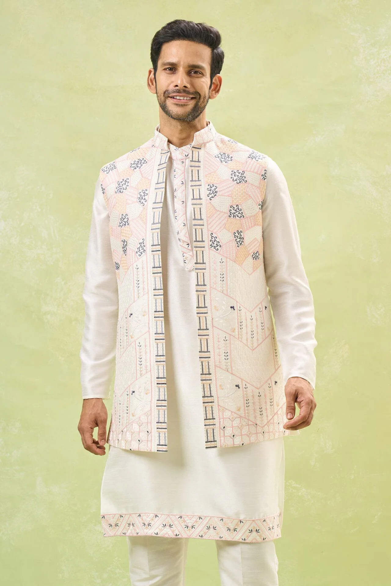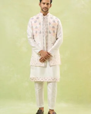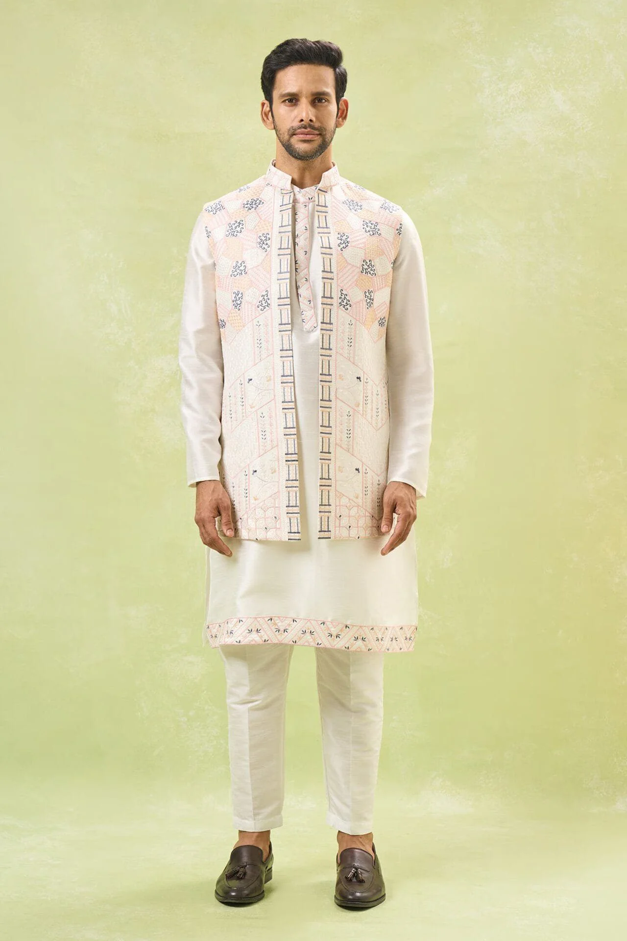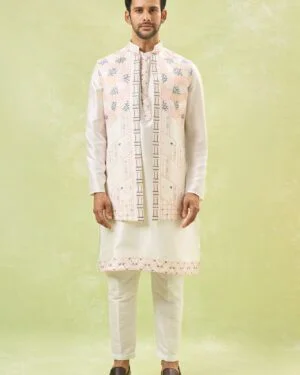 Off white dupion silk based open long jacket enhanced with thread and sequin embroidery, paired with a matching dupion silk based kurta enhanced with thread and sequin embroidery and an off white dupion silk based pants.