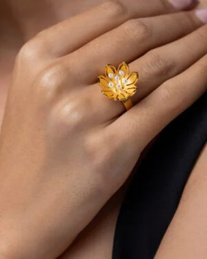 Bring a serene glow to your look with the Pearly Golden Flower Ring from the Saanjh collection.