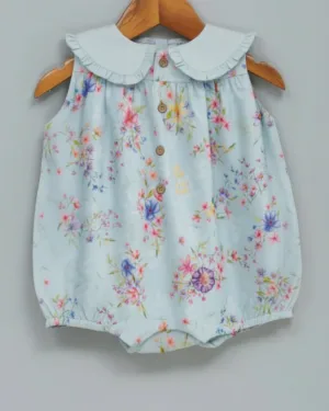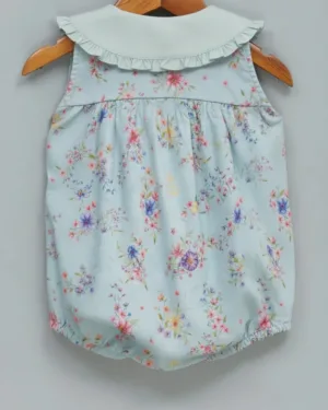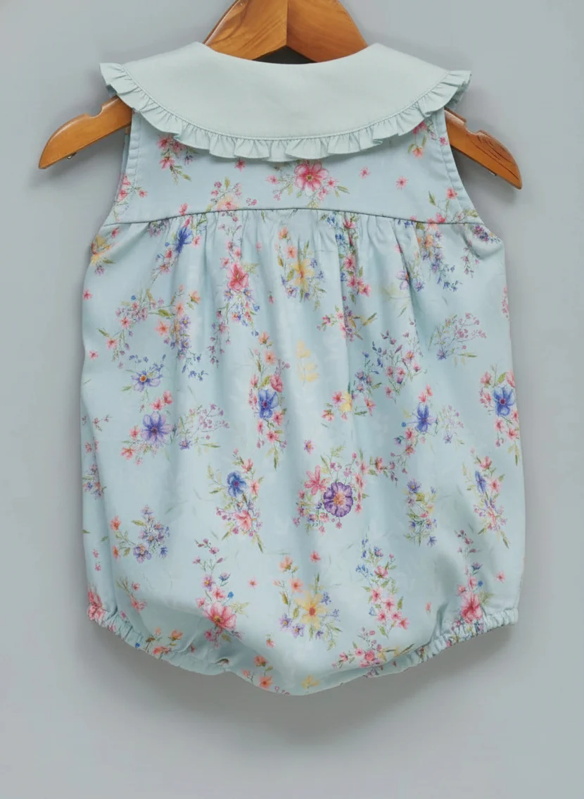 A sweet, classic romper with pretty, wild florals digitally printed with AZO free pigments. Delicate frills on the contrast collar add to its elegance