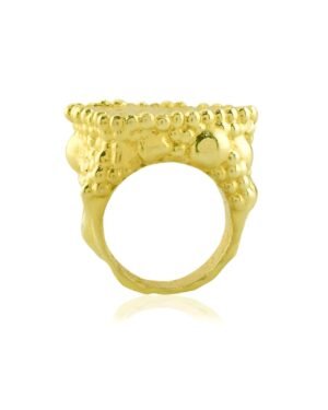 Step into the world of elegance with the Rugged Plateau Ring, an exquisite piece encapsulating the essence of Rajasthan's royal grandeur and artistic traditions. This ring features a hammer-textured flat top, inspired by the jali windows and majestic architecture of Pratapgarh's forts. Delicate rawa work around the edges evokes the sparkle of Rajasthan’s desert sands under the sun.