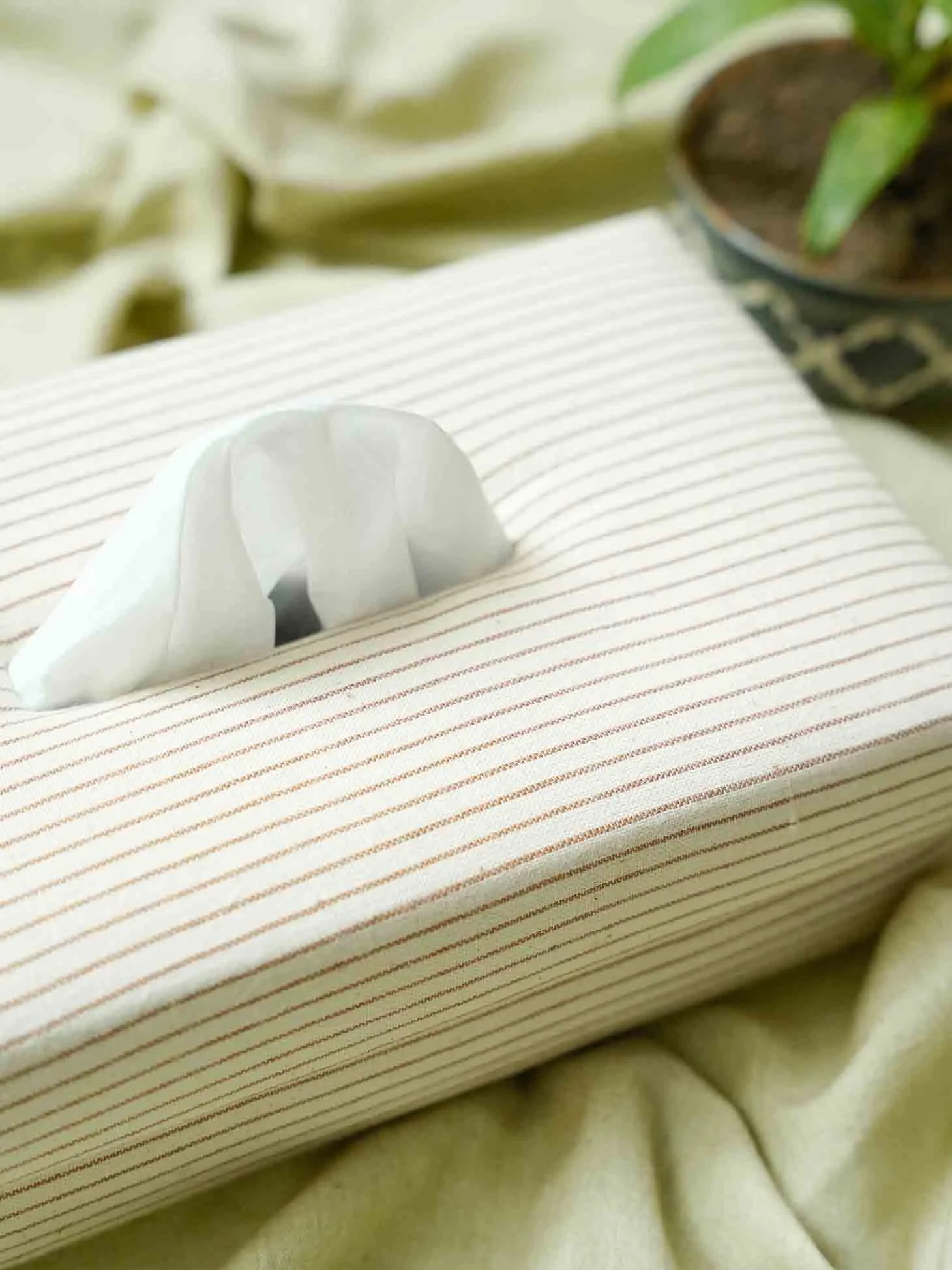 Ruhe stands for peace and symbolises Khadi - a profoundly delicate fabric to work with and, is steeped in Indian history. Our handcrafted khadi-cotton tissue box features minimalistic stripe pattern blended with an eco-friendly fabric, making it a thoughtful and conscious choice for your home.