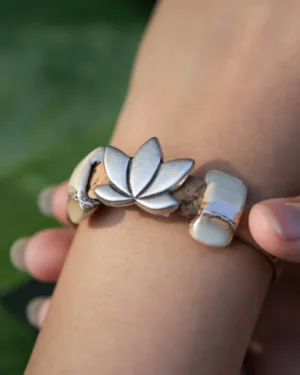 Introducing the Sacred Lotus Bracelet by FOReT. This beautiful, handcrafted piece is sure to make you stand out in any setting. Made with sustainable materials, this eco-friendly and cruelty-free accessory has a unique steel lock that provides a secure yet elegant look for any special occasion.