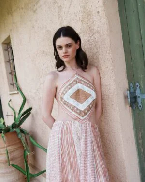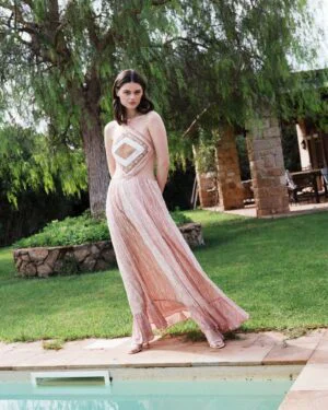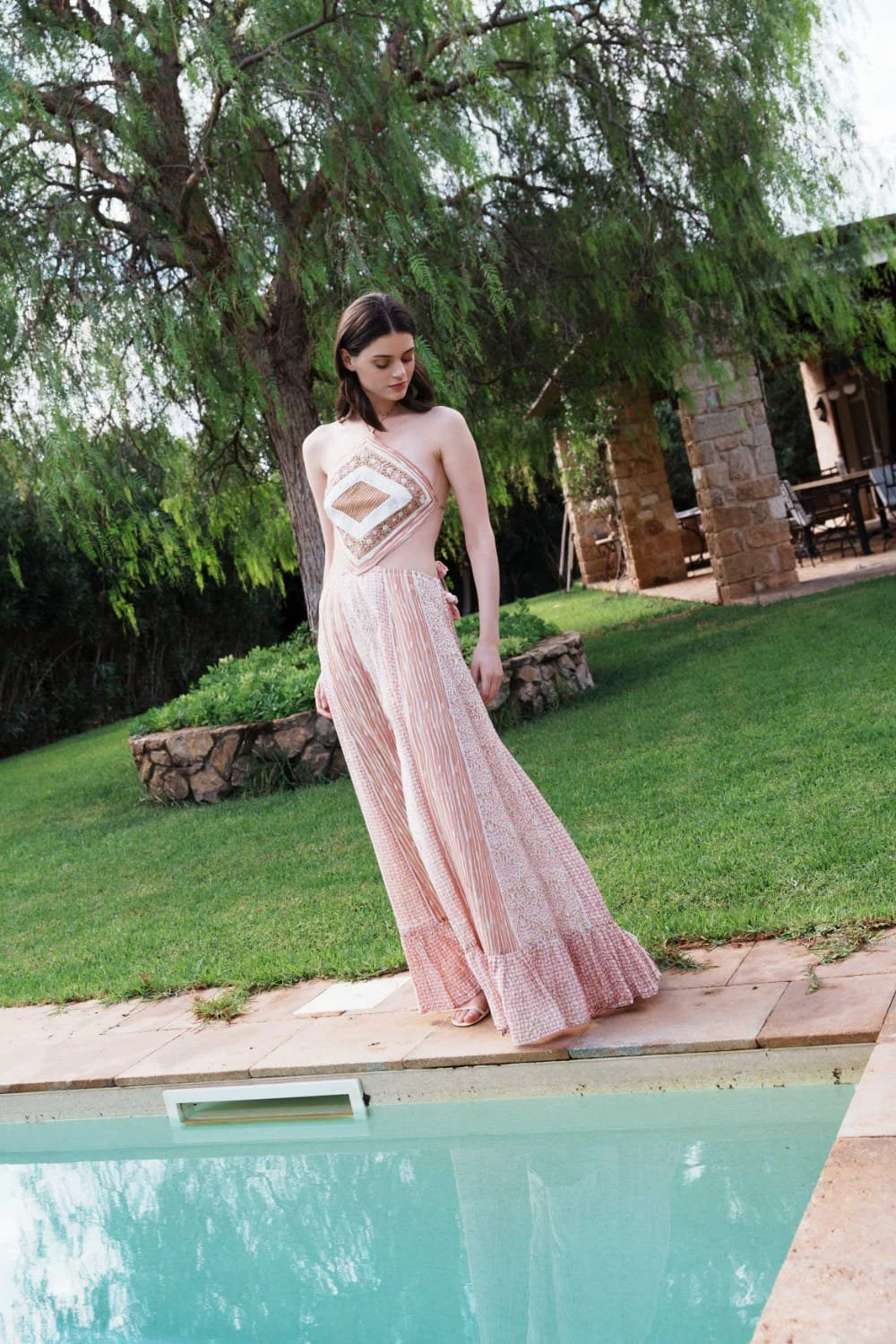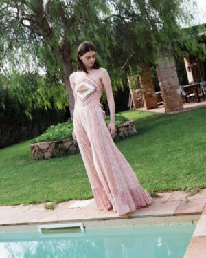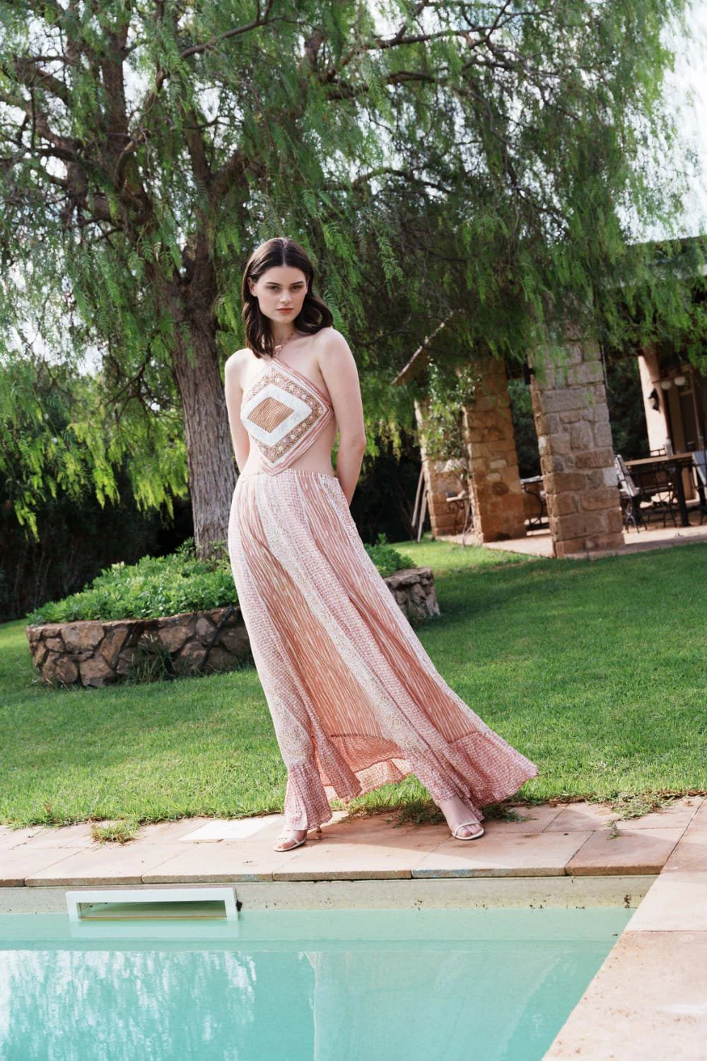 A beautifully detailed Salmon halter neck multi printed maxi with embroidered bodice that reflects Pinnacle by Shruti Sancheti?s artisanal precision and timeless design language.