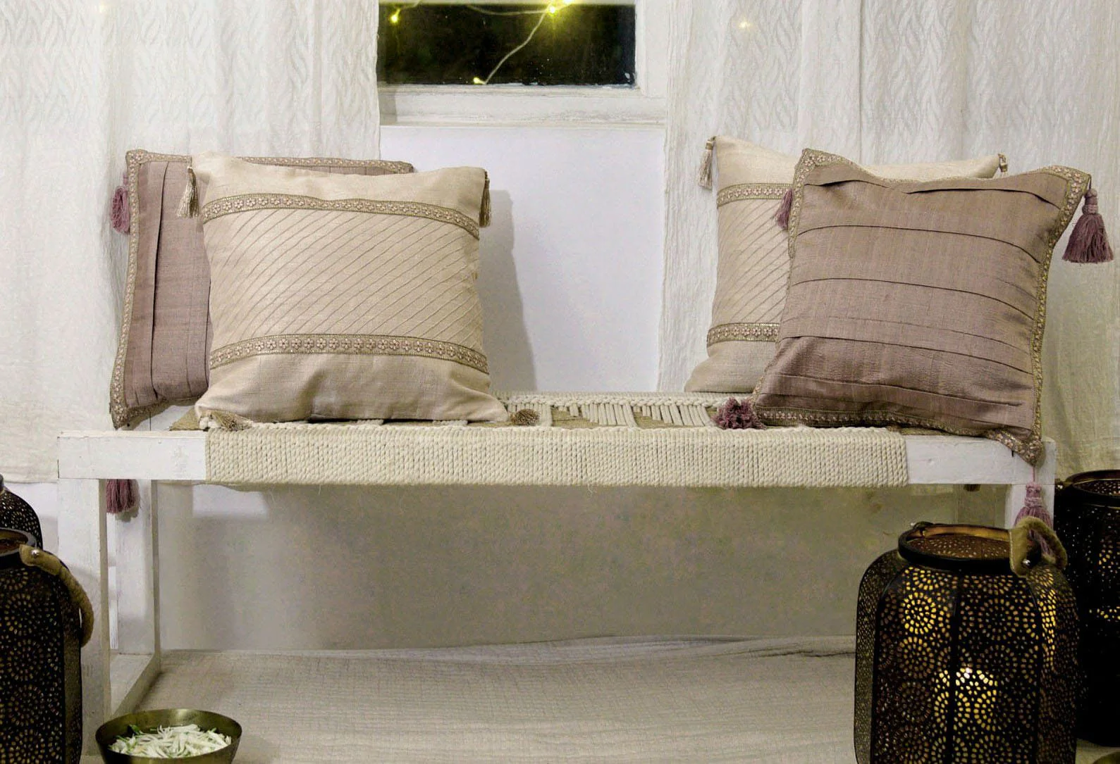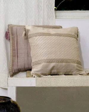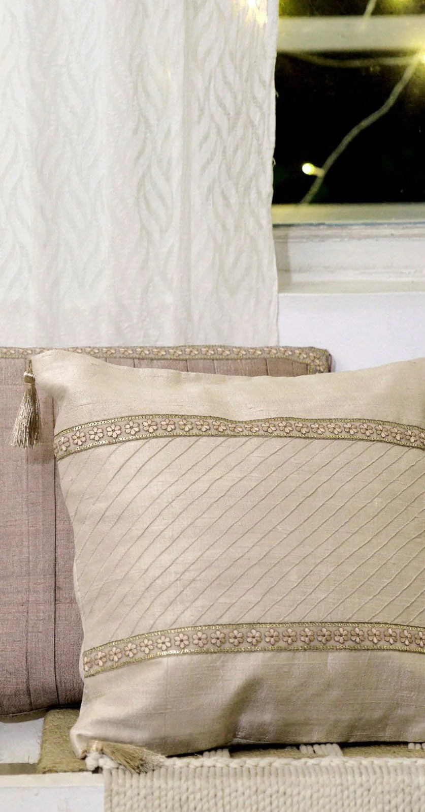Your search for the perfect festive gift ends here with the Sequoia 16’ x 16’ inch cushion. Discover the smooth texture of the handwoven Dupion silk fabric and the uniformly pleated design on the cushion. The Sequoia cushion is decorated with a hand-embroidered border and four zaree tassels on the corners.