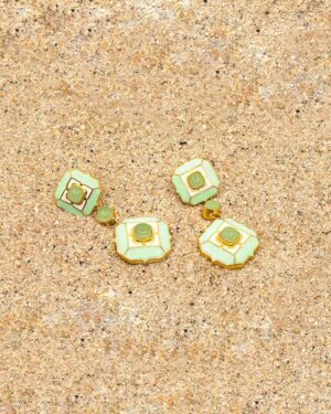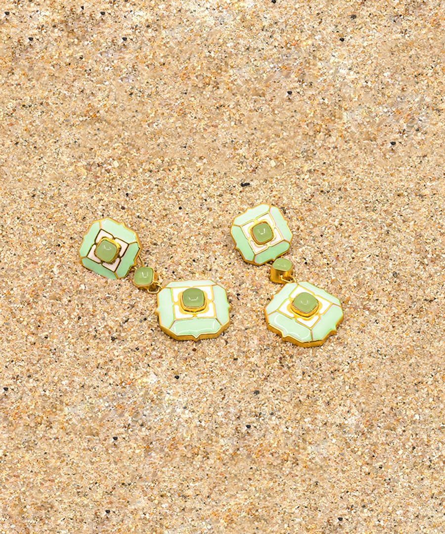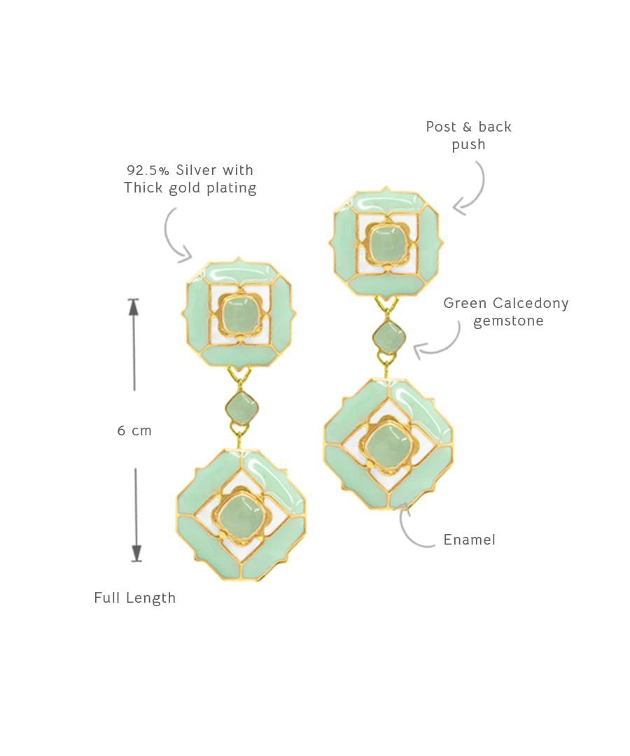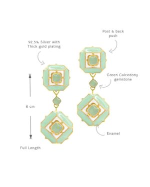 The swaying dangle earring has a post with push back, is handcrafted in 92.5% silver, and impeccable enamelling, It has thick gold plating. , Plating: Gold Plated, Metal Type: 92.5% Sterling Silver, Enamel / plating / gemstone: Natural gemstone Green Calcedony, Lock Mechanism: Post and push back, Measurement cm : 6cm , Measurement inches: 2.3 inch, Care Instruction: Keep away from water, perfume and other liquids. Do not use any cleaning agents. Clean when storing in the provided pouches. Store them in moisture free areas and keep them away from water and liquid fragrances.