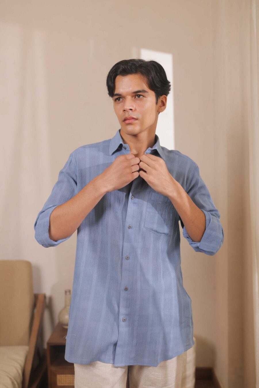 Crafted by skilled Indian artisans, the shirt blends traditional craftsmanship with a modern aesthetic. It’s a wardrobe essential for men who appreciate sustainable fashion, comfort, and understated charm.