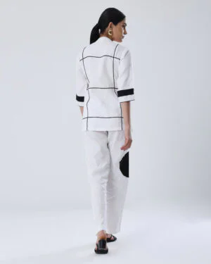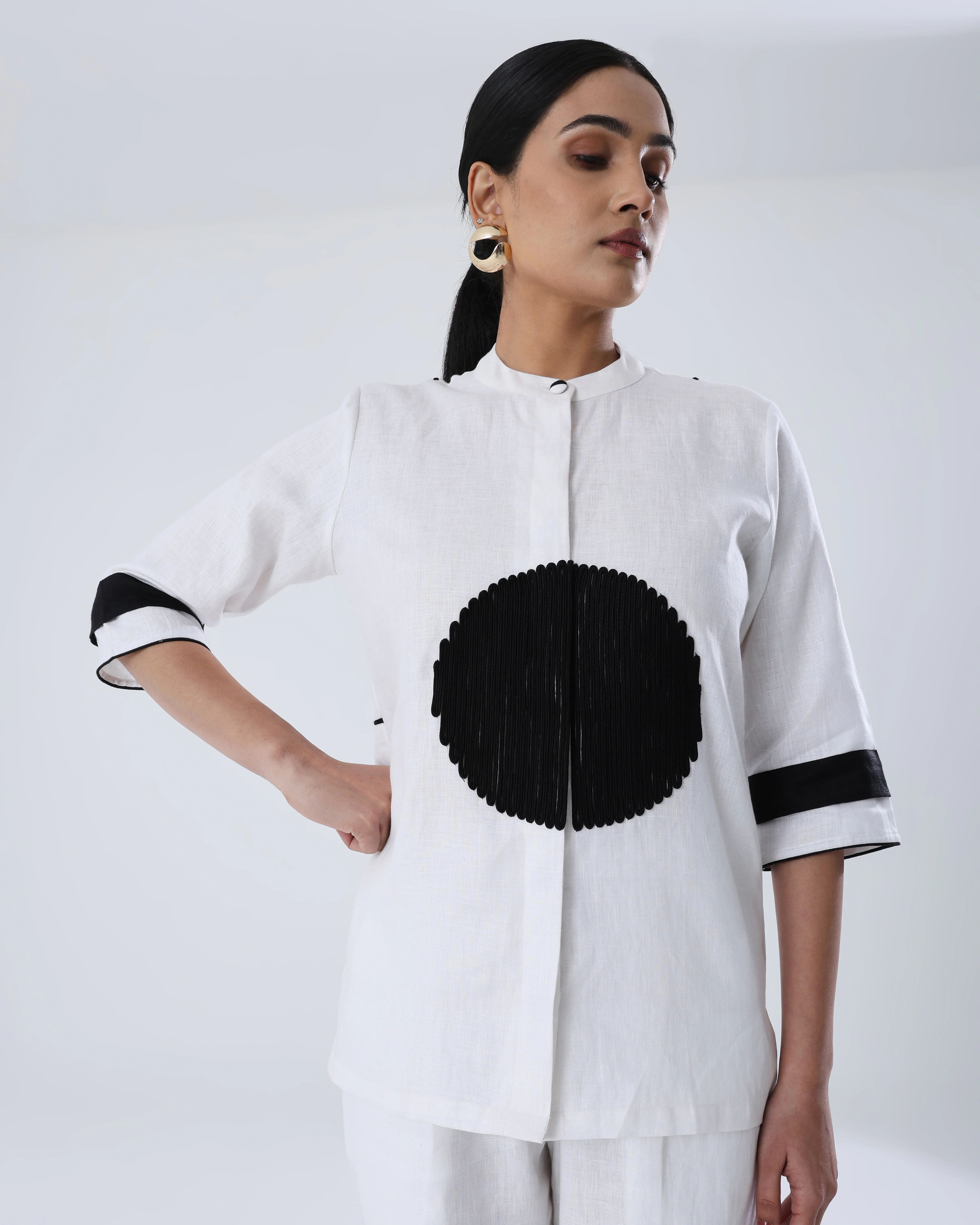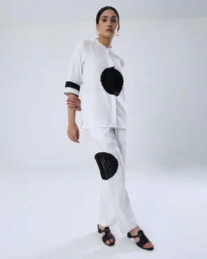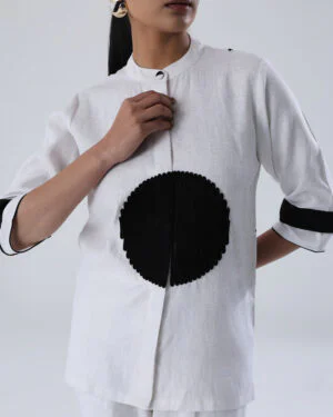 Make a bold statement with this contemporary SOLITAIRE SHIRT in 100% Hemp, designed for those who embrace minimalism with a twist. The standout feature is the bold black circular motif in the center, embellished with black dori work, adding an artistic and geometric element. The sleeves have matching black accents with a broad horizontal stripe near the cuff.