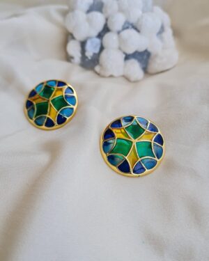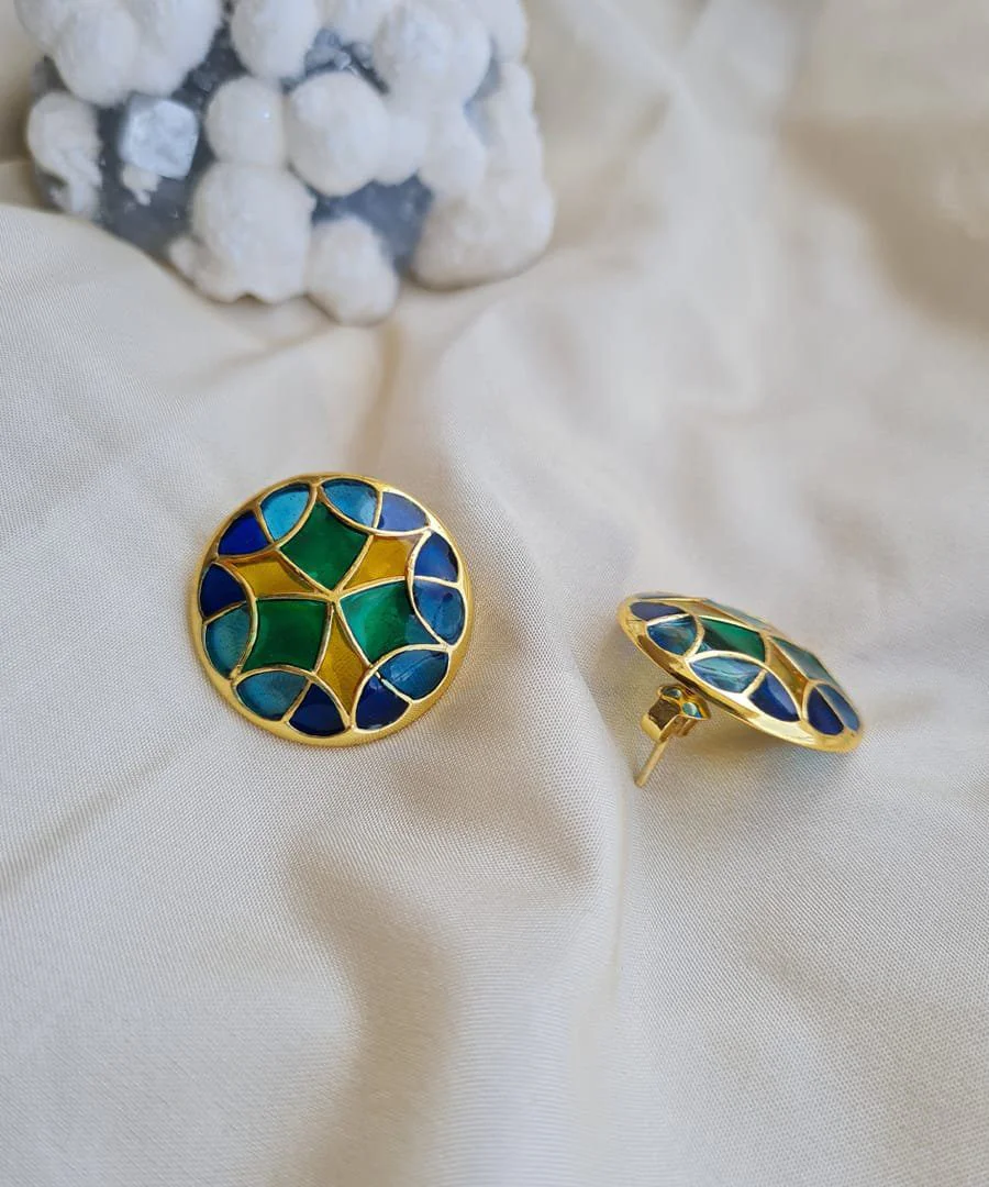 These Stud earrings are handcrafted in 92.5% silver, with thick gold plating. It has transparent enamel details in vibrant color & has a post and push back mechanism for easy wear. , Plating: Gold Plated, Metal Type: 92.5% Sterling Silver, Enamel / plating / gemstone: Transparent Enamel, Lock Mechanism: Post and push back, Measurement cm : 2.6 cm, Measurement inches: 1.02 inch , Care Instruction: Keep away from water, perfume and other liquids. Do not use any cleaning agents. Clean when storing in the provided pouches. Store them in moisture free areas and keep them away from water and liquid fragrances.