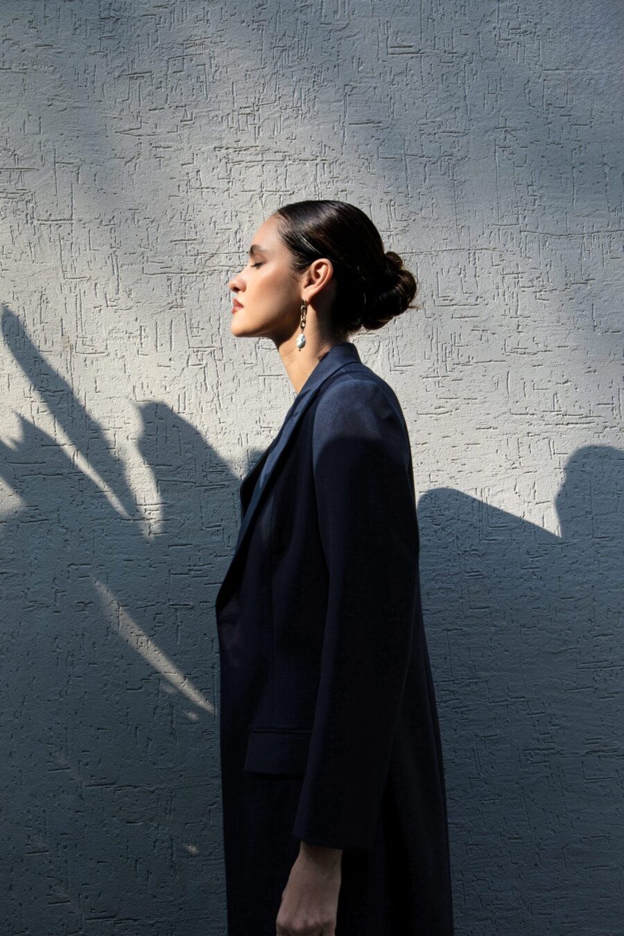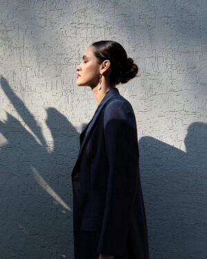 A study in modern power dressing, this three-piece set balances sharp tailoring with unexpected details. The calf-length blazer, cinched with a satin belt, flows with quiet authority, while the surplice-back waistcoat adds an alluring twist and subtle sculptural interest. Sleek tailored trousers complete the look, creating a streamlined silhouette that moves effortlessly from elevated office moments to chic evening gatherings. Poised, confident, and effortlessly contemporary, this ensemble embodies understated luxury with a modern edge.