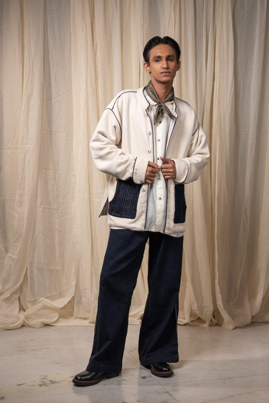 The silhouette features a Mandarin collar, side slits for ease, and broad cuffs finished with handwoven grey stripes and Midnight Black piping. Pockets in handwoven Midnight Black cotton are pintucked for subtle structure and contrast. Ceramic buttons complete the piece — adding a textural detail.