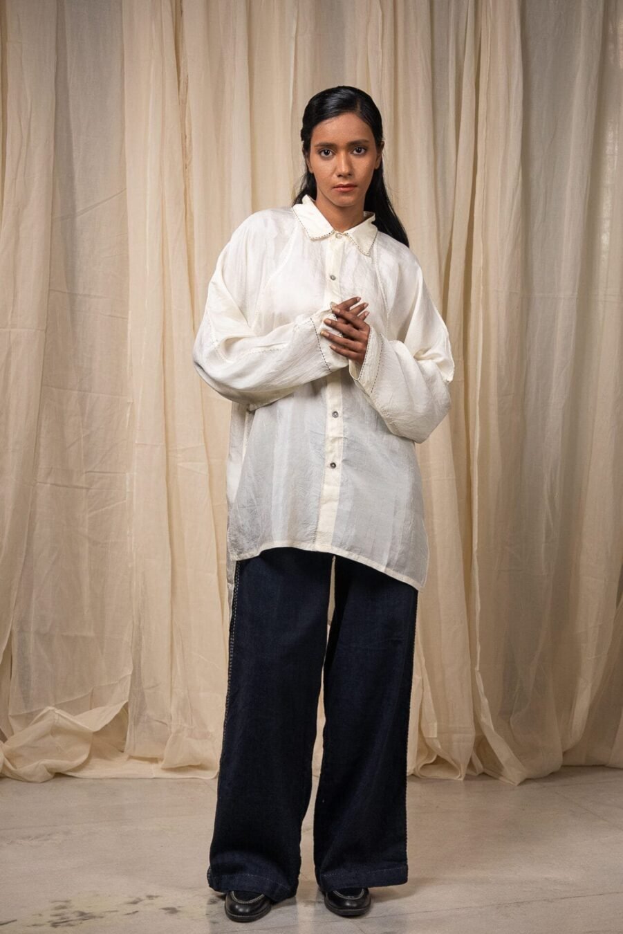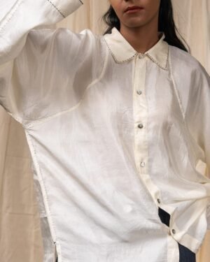 Made from 100% undyed natural silk, The Curve Shirt is crafted in handwoven silk that celebrates the natural tone and texture of the fibre. The surface is adorned with hand-done Kantha lines, adding gentle rhythm and tactile depth to the flowing silk base.