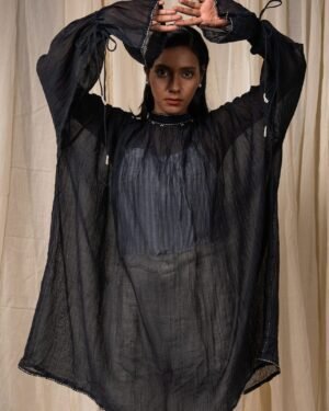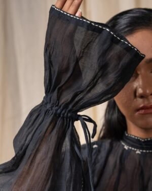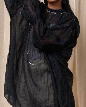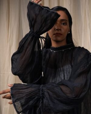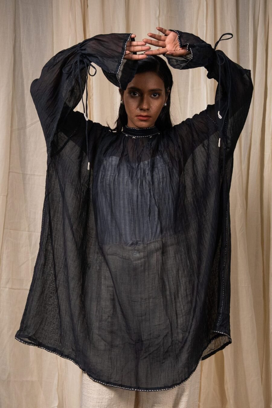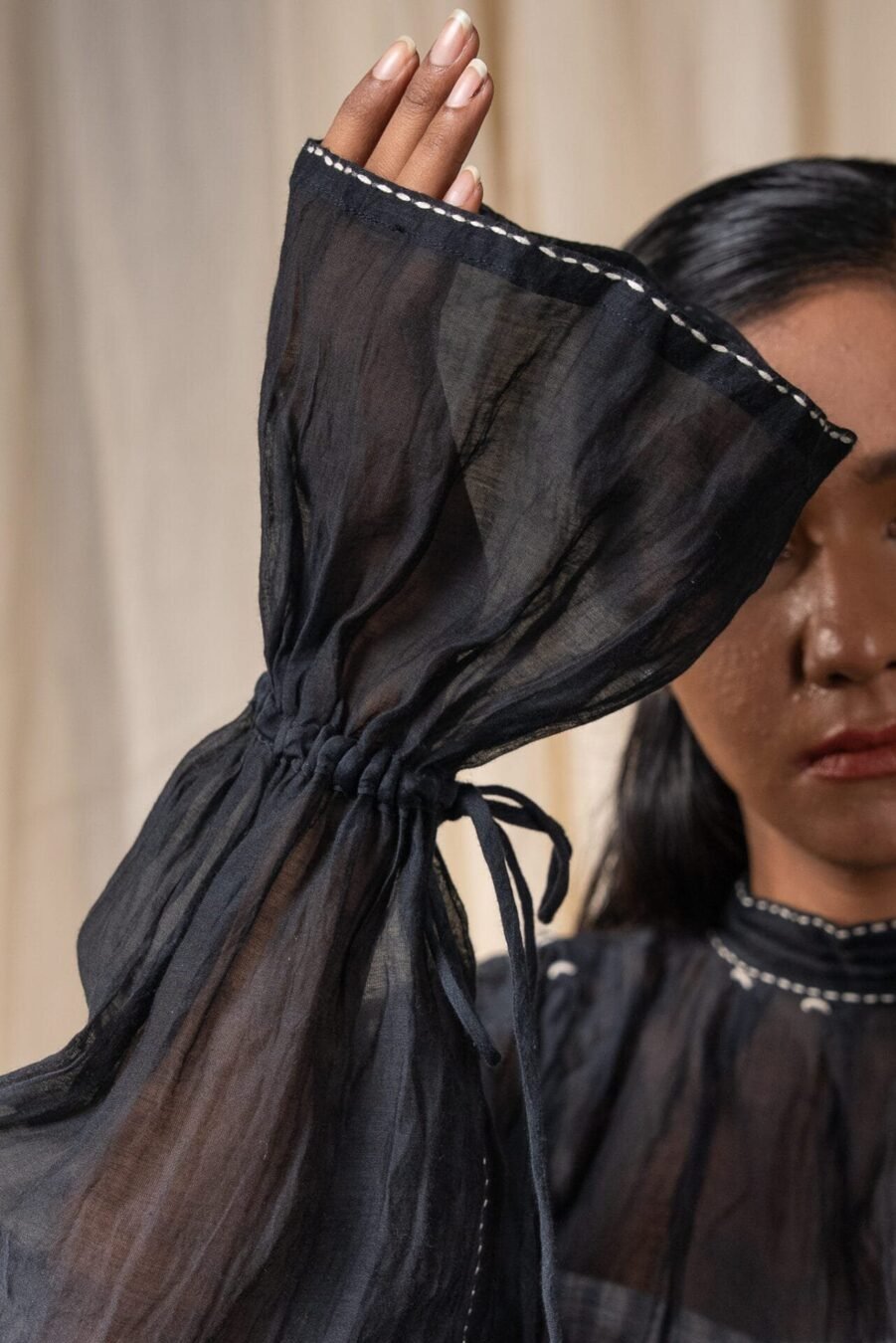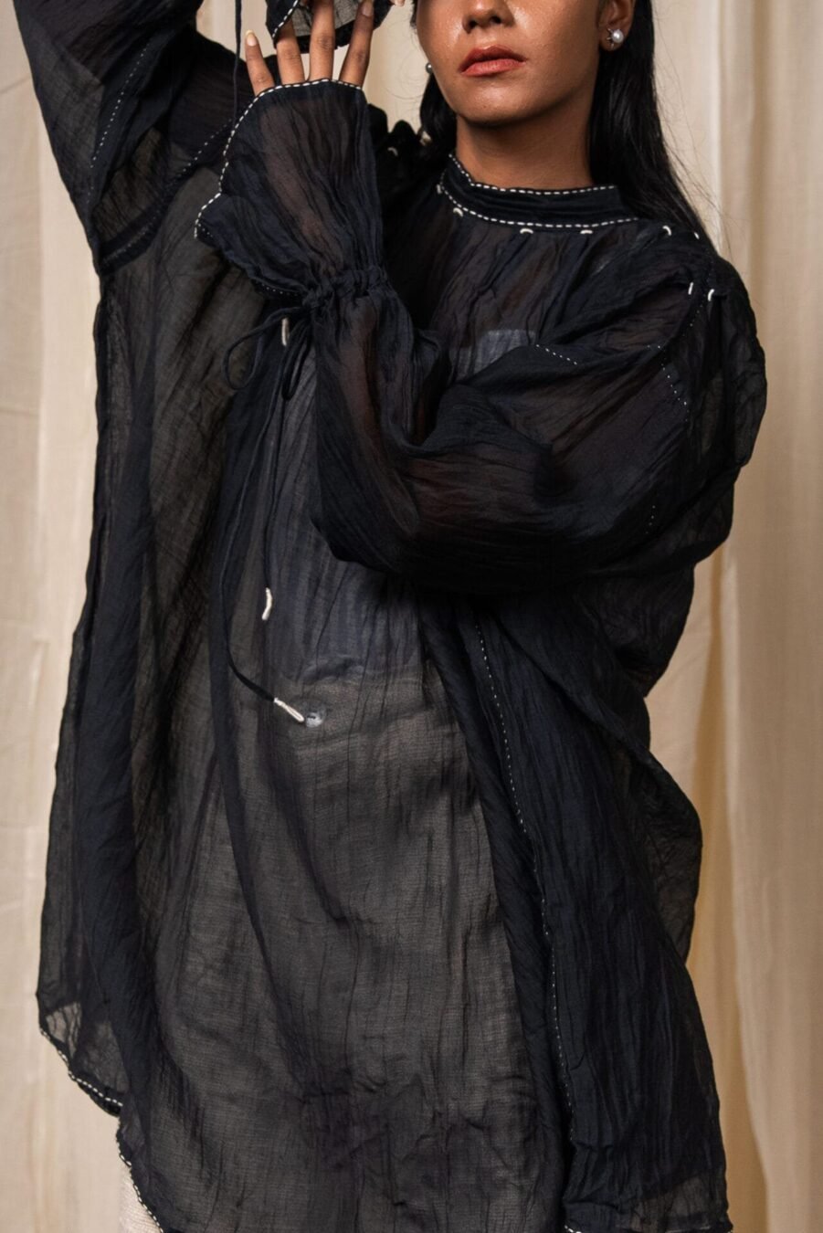 Made from 100% Chanderi and natural materials, this blouse is azo-free dyed in black. The sheer fabric is detailed with pleats around the shoulders, finished with delicate notches and lines of Kantha.
