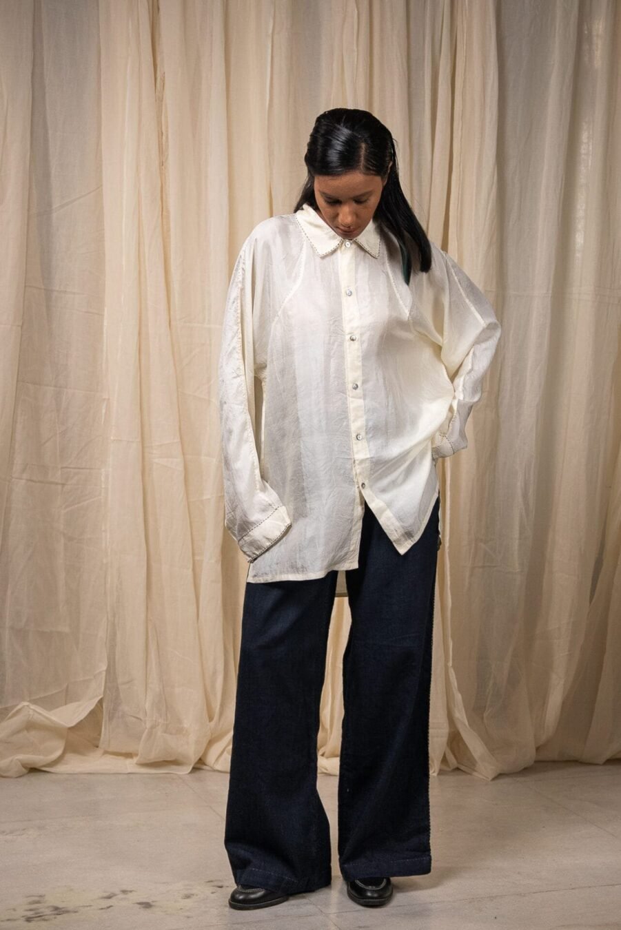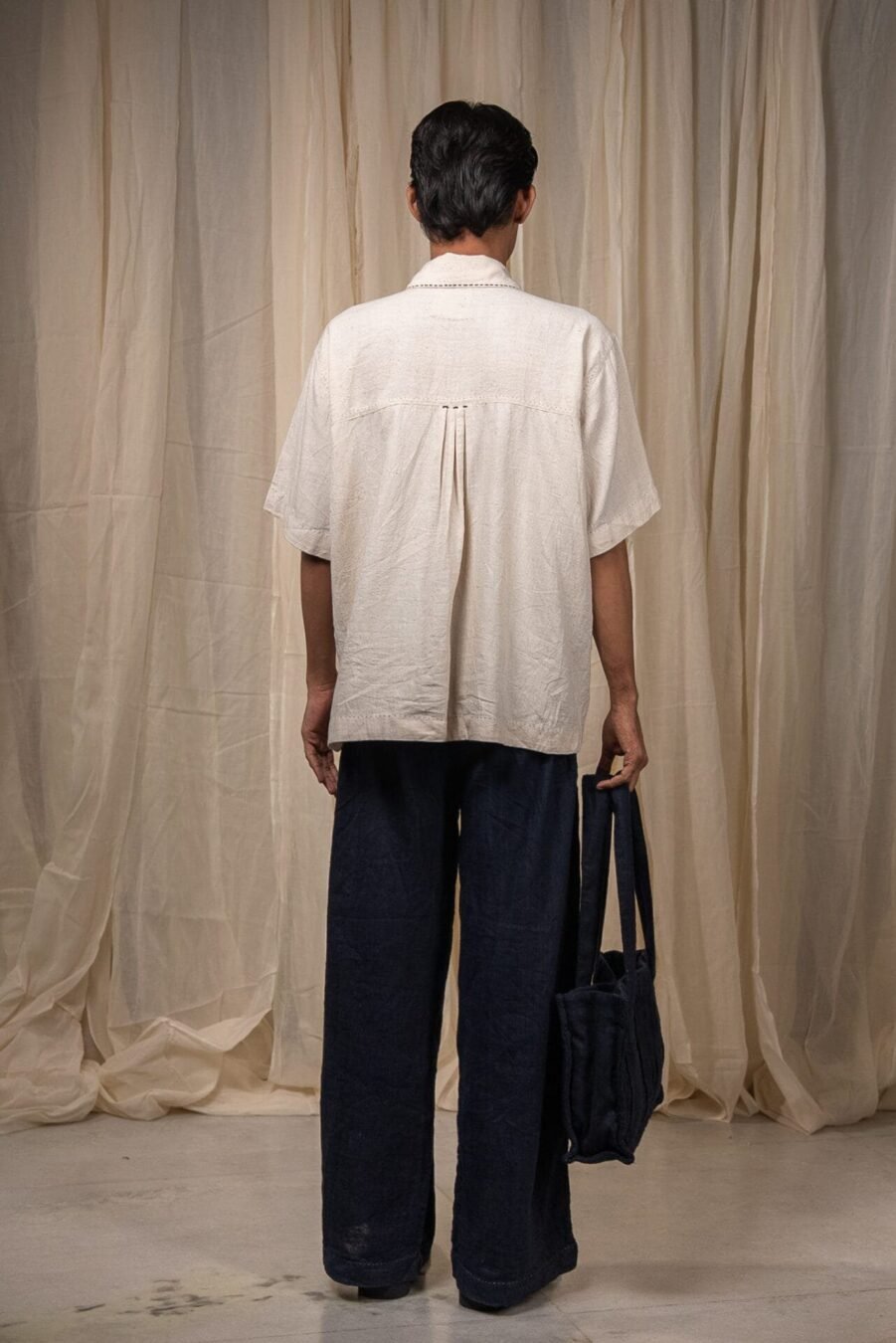 Crafted from 100% cotton fibres and natural materials, this straight-leg pant is made from azo-free dyed Midnight Black handwoven cotton. Inverted pleats with subtle notches add quiet structure, while Kantha embroidery runs along the side seams and pocket - a tactile, handcrafted detail.