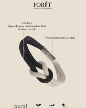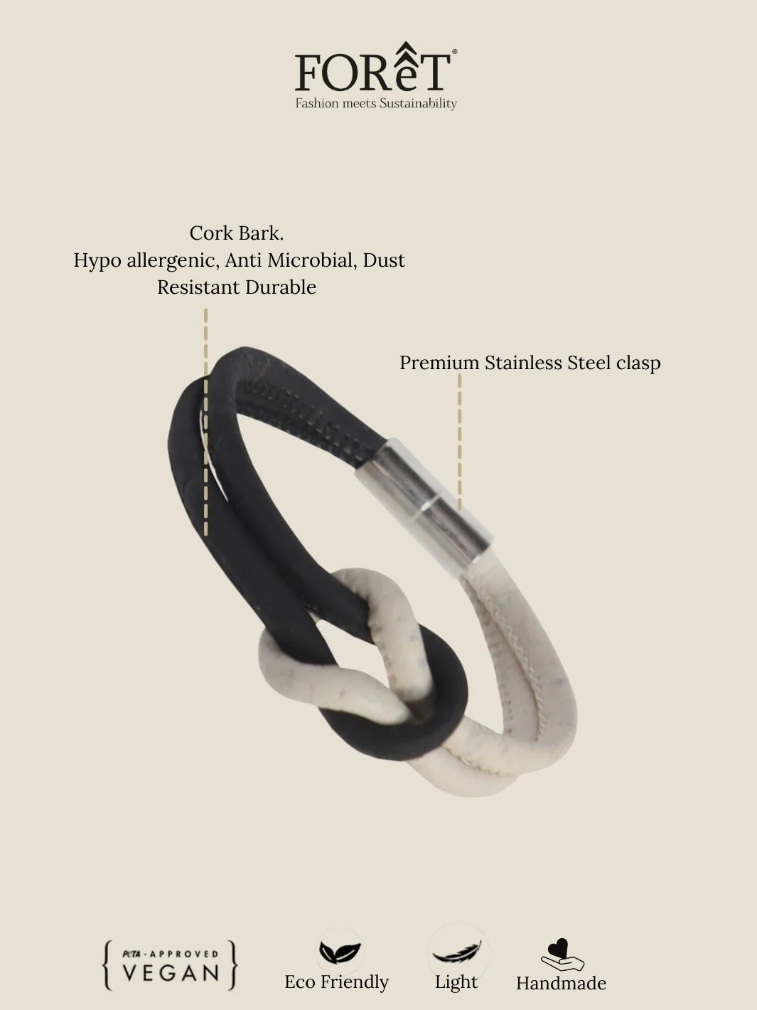 A quirky twist to the elegant cork fabric, The Roots is an interlocked bracelet that signifies the beginning. A chic knot guarded by premium European Stainless steel clasp. this bracelet can be worn independently or stacked together with our range of bracelets.