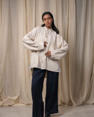 Made from 100% cotton fibres and natural materials, the Seam Shirt is crafted in undyed and unbleached Kora Kala cotton - a soft, textured fabric that holds the natural character of the fibre. Hand-done Kantha embroidery runs along the seams, complemented by piping in grey striped handwoven cotton, subtly framing the garment’s structure.