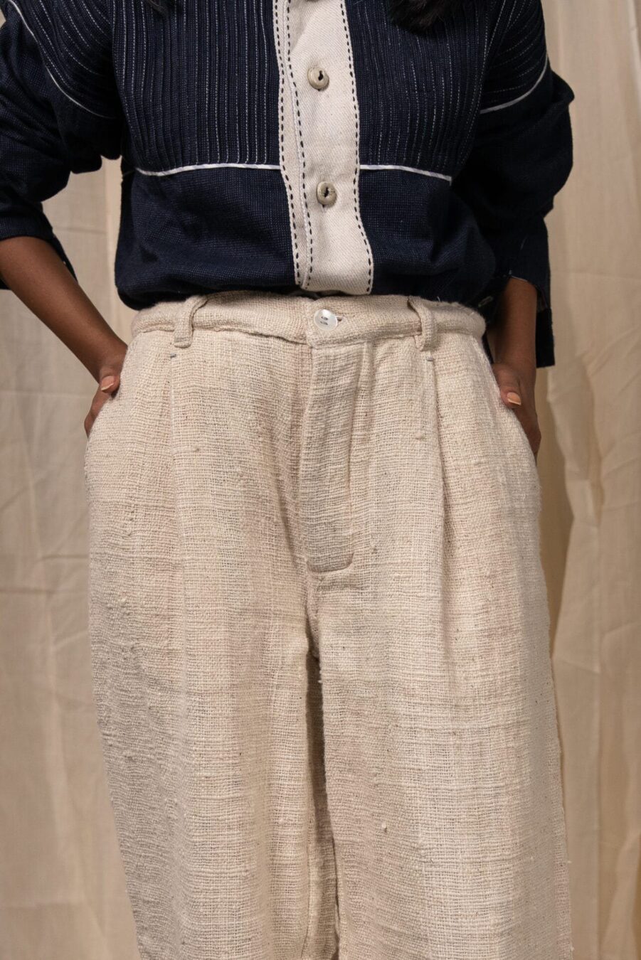 Crafted from 100% cotton fibres and natural materials, this straight-leg pant is made in undyed, unbleached zero count handwoven cotton - a thick, textural fabric that holds shape with structure. Pockets are finished with piping in handwoven grey striped cotton, adding subtle contrast and detail.