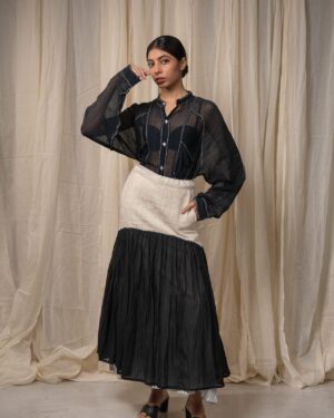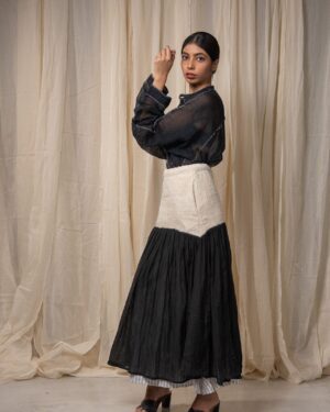 Crafted in two layers- Azo-free dyed black Chanderi outer layer and a handwoven striped cotton lining. The undyed and unbleached zero-count cotton structures the waist and hip, from where the Chanderi gathers cascade into fluid movement. This skirt plays with weight and transparency, creating depth through contrast in fabrics.