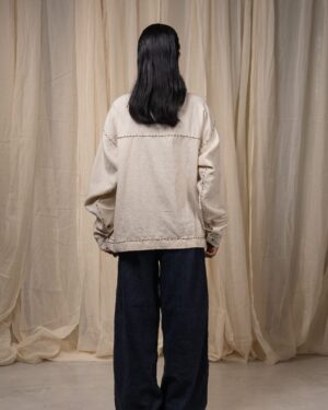 A return of one of our favourite pieces from the past. Crafted from 100% cotton fibres and natural materials, this undyed and unbleached Kala cotton jacket features a shirt collar, flap pockets, and structured panelling. The panelling is detailed with the couching technique of embroidery- a subtle yet distinctive mark of hand and craft.Please note that this fabric is handwoven using traditional weaving techniques, so may vary in colour and texture.