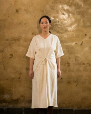 Everyday comfort with this V-neck, drawstrings lazy dress. Wear it from the front or back. Loose and breezy for a balmy day/ night out. Colors available.; Craft: Handloom Weaved, Material: Lotus Silk, Return Policy: Non-Returnable, Shipping: 8 to 10 Working Days, Fit: Loose, Occasion: Casual, Sleeve: Yes, Care Description :"Washing Instructions: Fill your bucket with cold water, turn your Lotus silk item inside out, and submerge it. It comes to washing your Lotus silk item, your best bet is to use a high-quality liquid detergent. Add a few detergent drops into the water and stir it well, then leave your item in the solution for three minutes. Gently pull your garment up and down for three to five minutes to remove any dirt. Take your garment out from the sink, drain off the water, and rinse under cold water until the detergent has been completely washed out. Never wash with