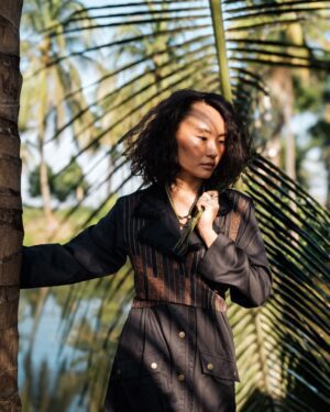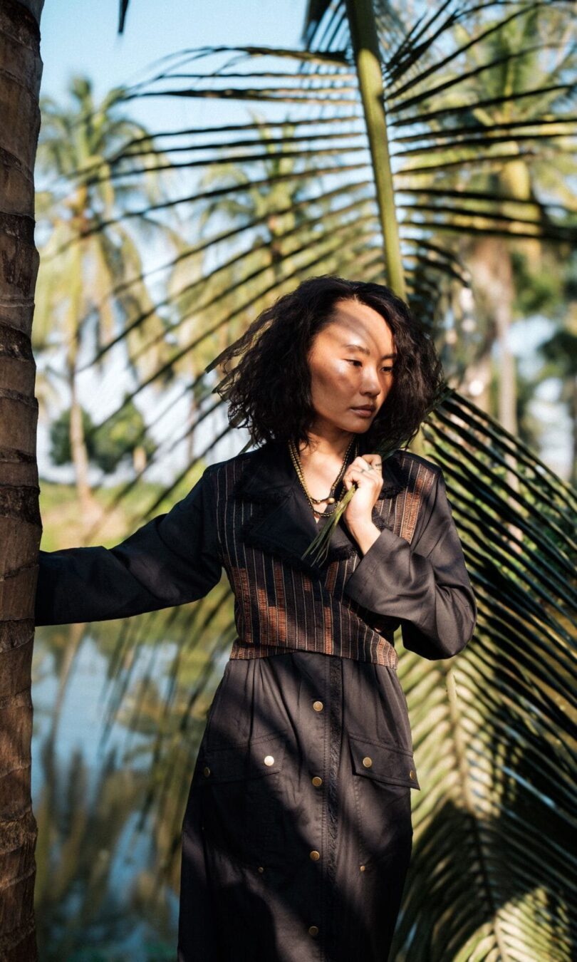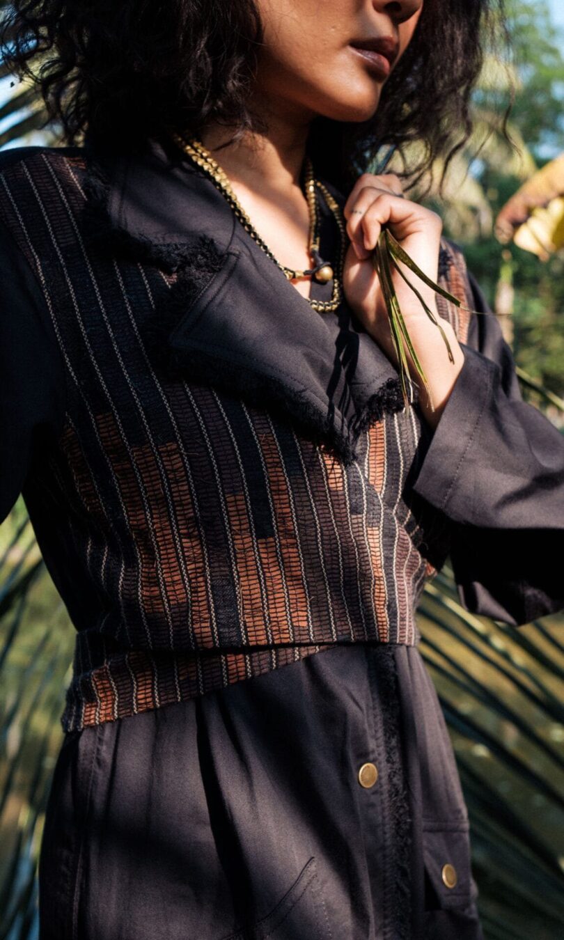 The garment is made from hand woven upcycled fabric and so the color might vary slightly for each batch.