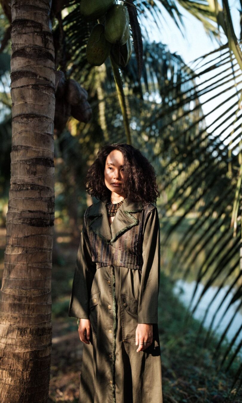 The garment is made from hand woven upcycled fabric and so the color might vary slightly for each batch.