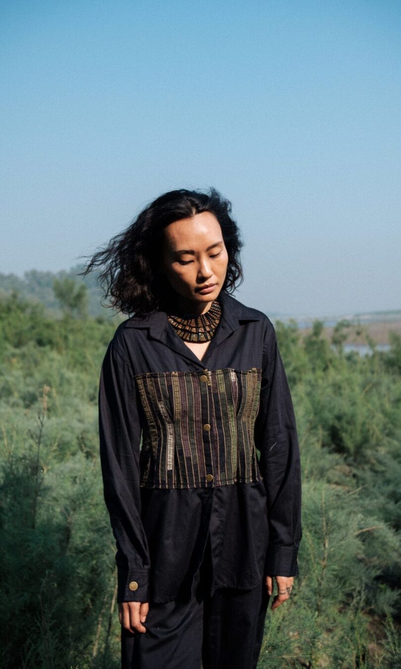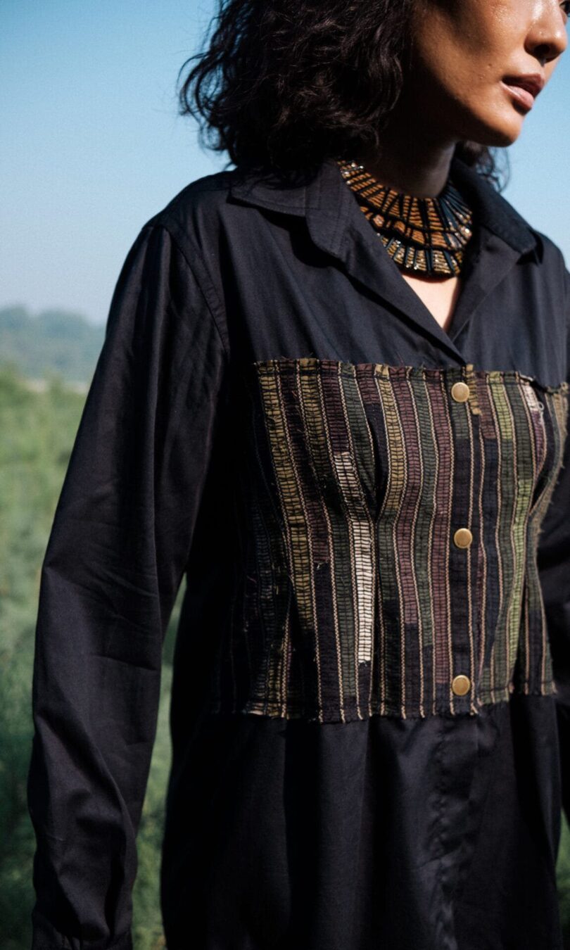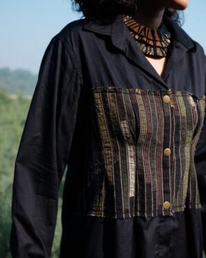 The garment is made from hand woven upcycled fabric and so the color might vary slightly for each batch.