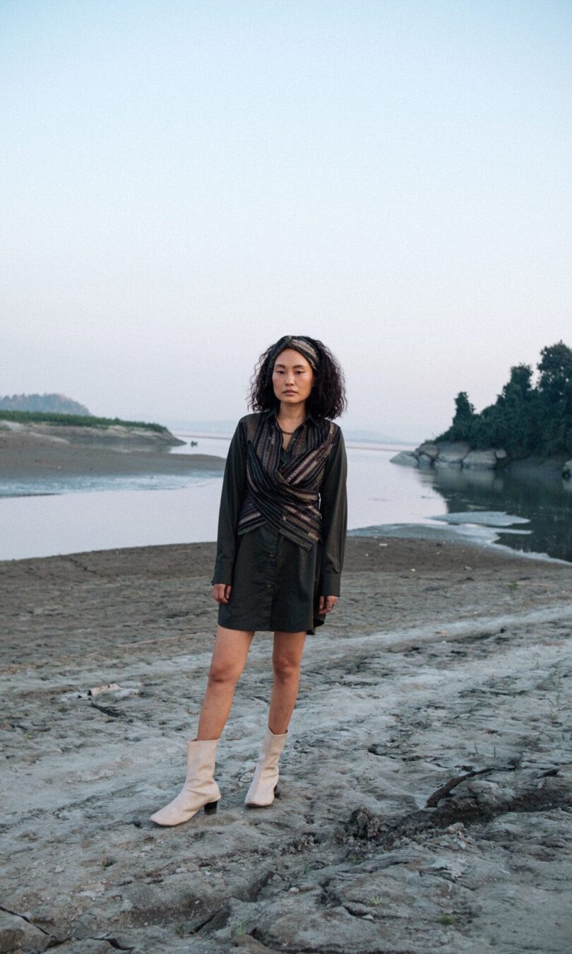 A truly exquisite wrap shirt short dress that seamlessly transforms from a sophisticated staple to a casually chic garment designed from upcycled fabric, made using post production waste.