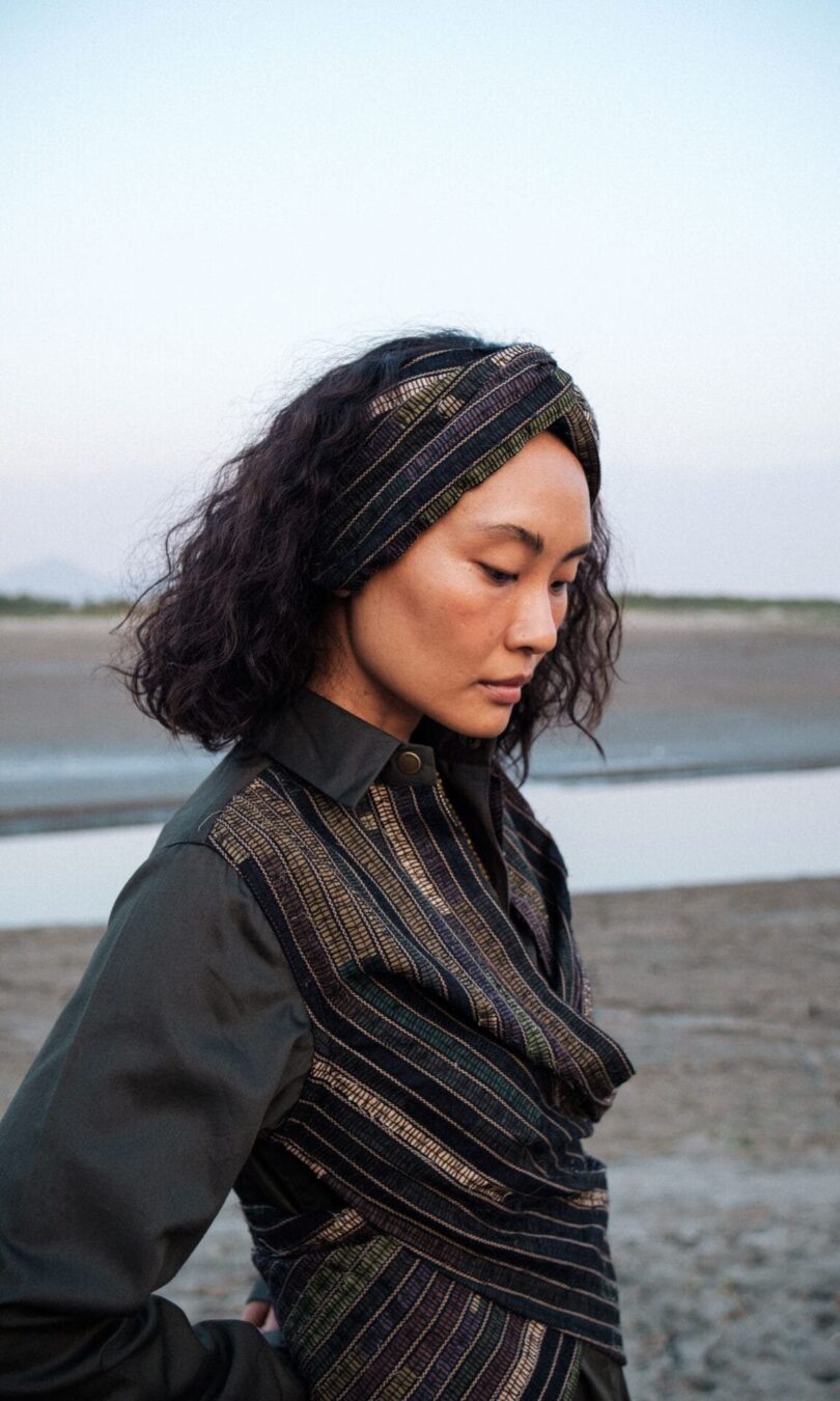 The garment is made from hand woven upcycled fabric and so the color might vary slightly for each batch.