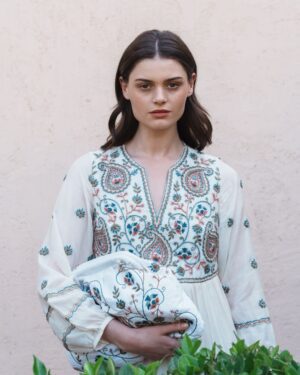A beautifully detailed White mul paisley embroidered tiered maxi that reflects Pinnacle by Shruti Sancheti?s artisanal precision and timeless design language.